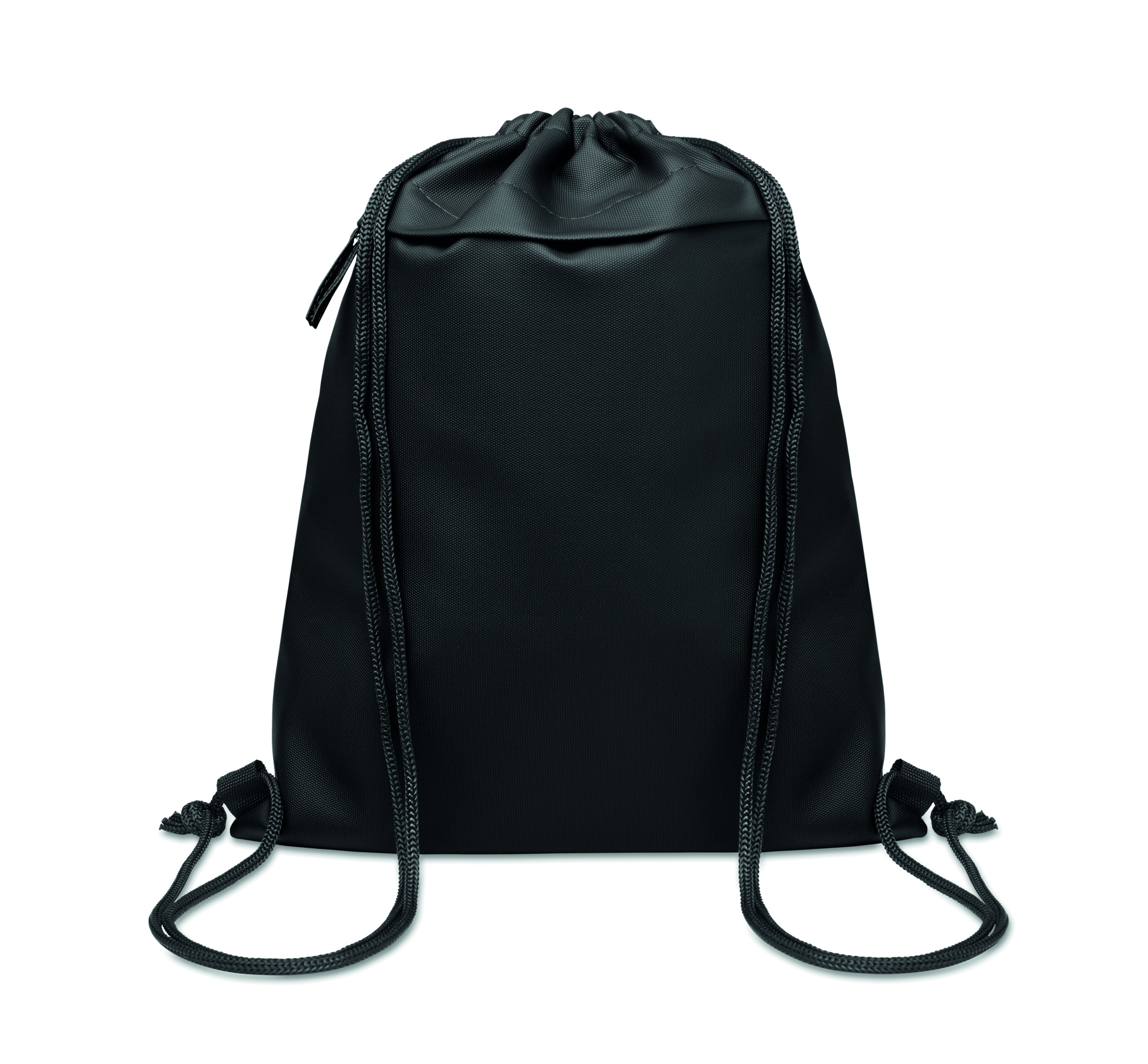 Beutel mit Kordelzug aus PU-beschichtetem 600D RPET-Polyester und 190T RPET-Polyesterfutter. Fronttasche mit Reißverschluss.