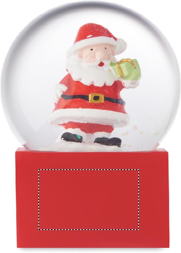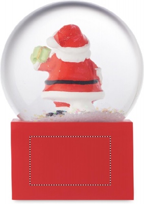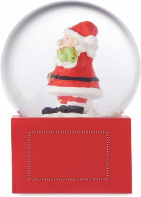 Kleine weihnachtliche Schneekugel aus Glas mit Sockel aus Polyresin.