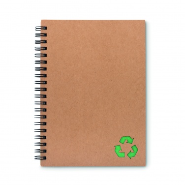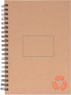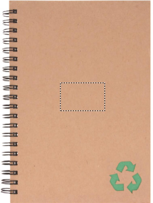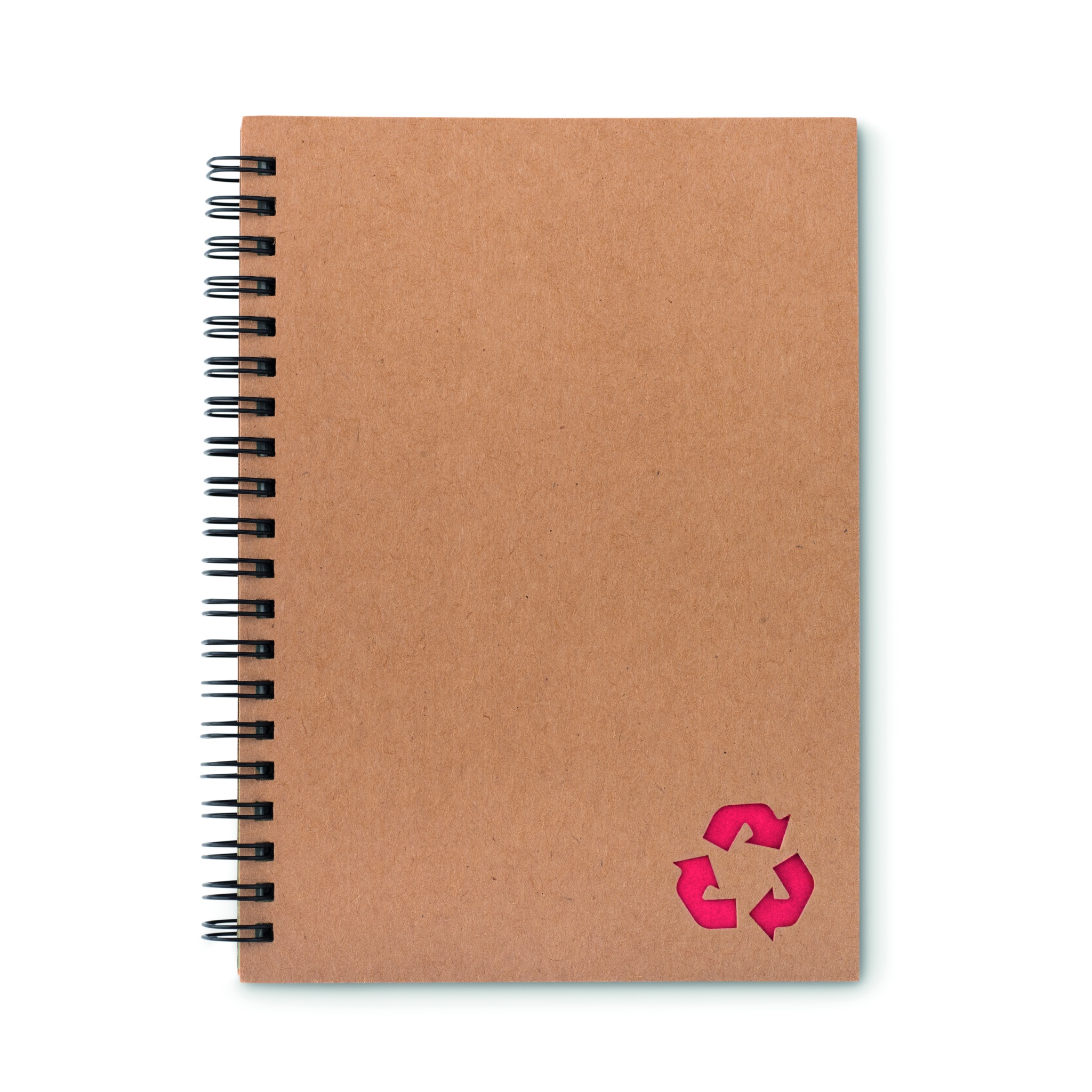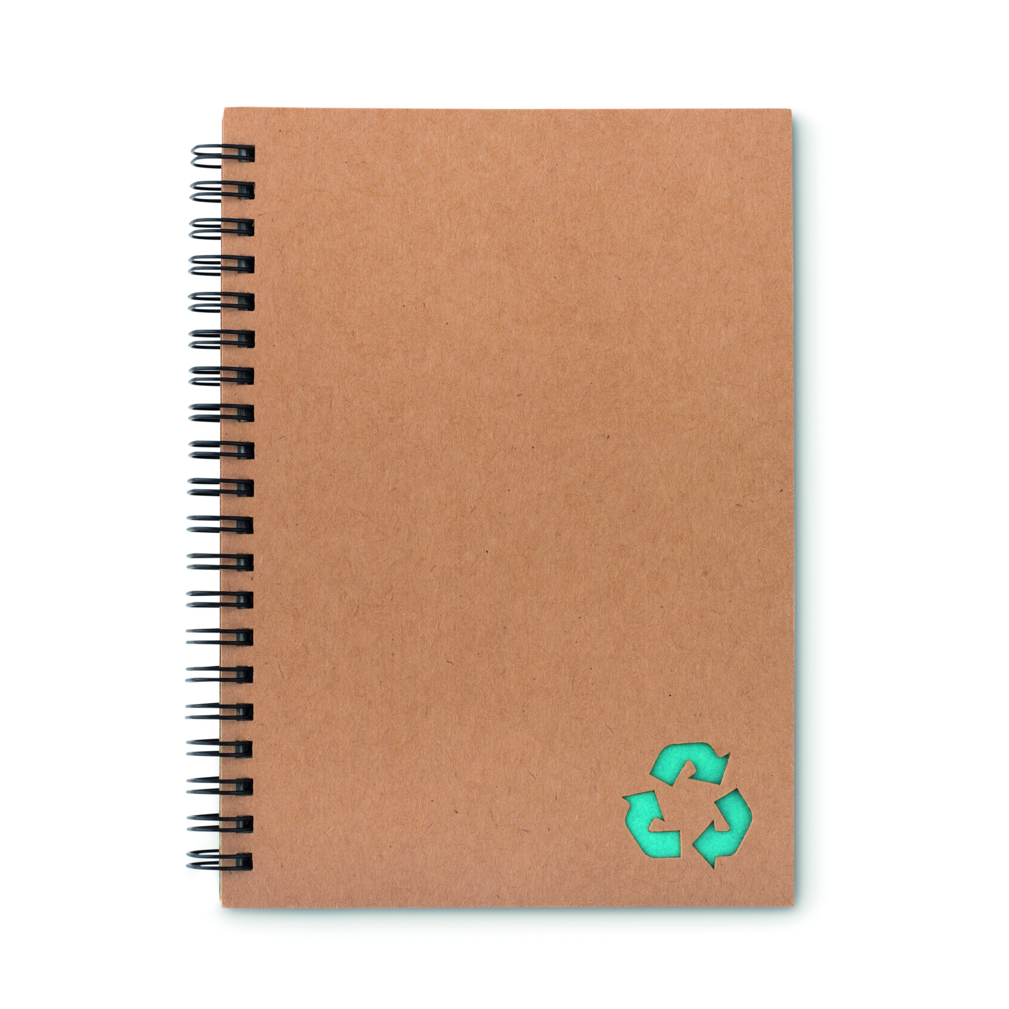 Notizbuch mit recyceltem Kartoneinband. Doppeldraht. 140 linierte Seiten aus Mineralpapier (70 Blatt). Mineralisches Papier wird aus Kalziumkarbonat und HDPE (Polyethylenharz) hergestellt. HDPE wird als Bindemittel verwendet. Es ist wasserdicht und Beständig gegen Fett.
