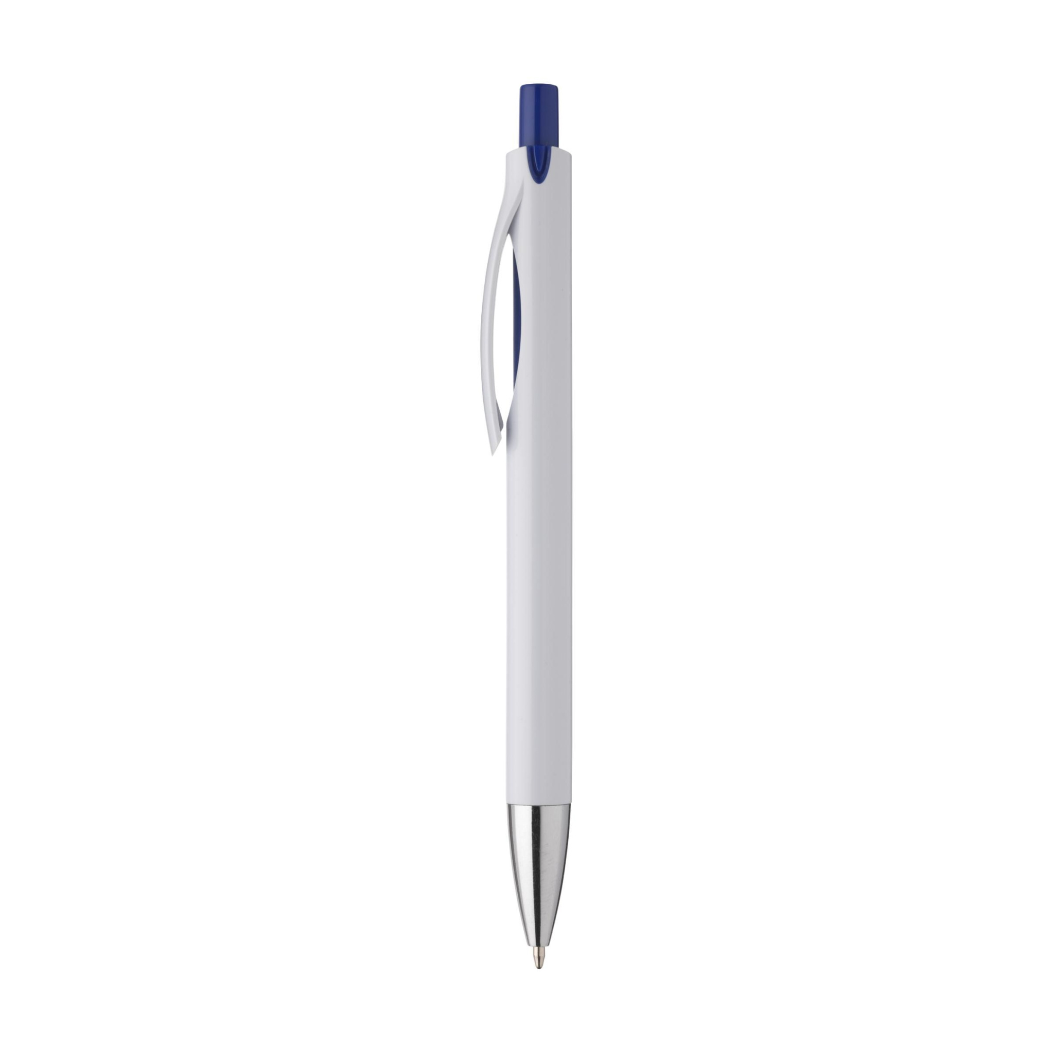 Blauschreibender Kugelschreiber in stilvollem Design: Bei diesem Stift sind Korpus und Clip integriert. Markante Farbakzente unterhalb des Clips. Diese Akzentfarbe ist auf die Farbe des Druckknopfes abgestimmt.