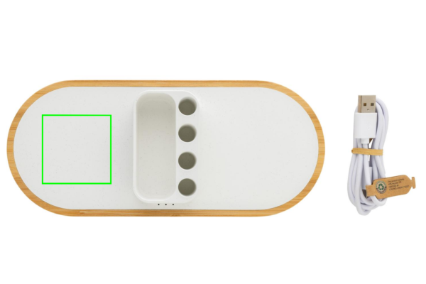Schneller 10W-Dual-Wireless-Charger mit Stifthalter aus RCS-zertifiziert (Recycled Claim Standard) recyceltem ABS. Gesamter Recyclinganteil: 31% basierend auf dem Gesamtgewicht des Artikels. Die RCS-Zertifizierung gewährleistet eine vollständig zertifizierte Lieferkette der recycelten Materialien. Die Basis besteht aus 100% FSC®Bambus. Kabelloses Laden ist kompatibel mit Android der neuesten Generation, iPhone 8 und höher. Kann zwei Telefone gleichzeitig oder jedes andere QI-fähige Gerät aufladen. Mit 4 Stiftlöchern zum Aufbewahren von Stiften sowie einer kleiner Ablage für z.B. Visitenkarten oder andere kleine Gegenstände. Artikel und Zubehör PVC-frei. Inklusive 120cm Type-C Kabel aus RCS-zertifiziertem Recycling-TPE. Verpackt in FSC®Mix Kraftkarton. Type-C Input: 5V/2A; 9V/2A; Wireless Output: 5V/1A; 9V/1,1A; (10W) Registered Design®