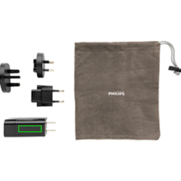 Philips ultraschnelles 30W-PD-Reiseladegerät kommt in praktischer Reisetasche und mit 4 Steckern; integrierter US-Stecker und wechselbare AU-, UK- und EU-Stecker. Input: 100-240V, 50-60Hz 0,7A; USB-A Output 5V/2,4A; Type-C 5V/3A, 9V/2A, 12V/1,5A. Verpackt in einer Philips Geschenkbox.