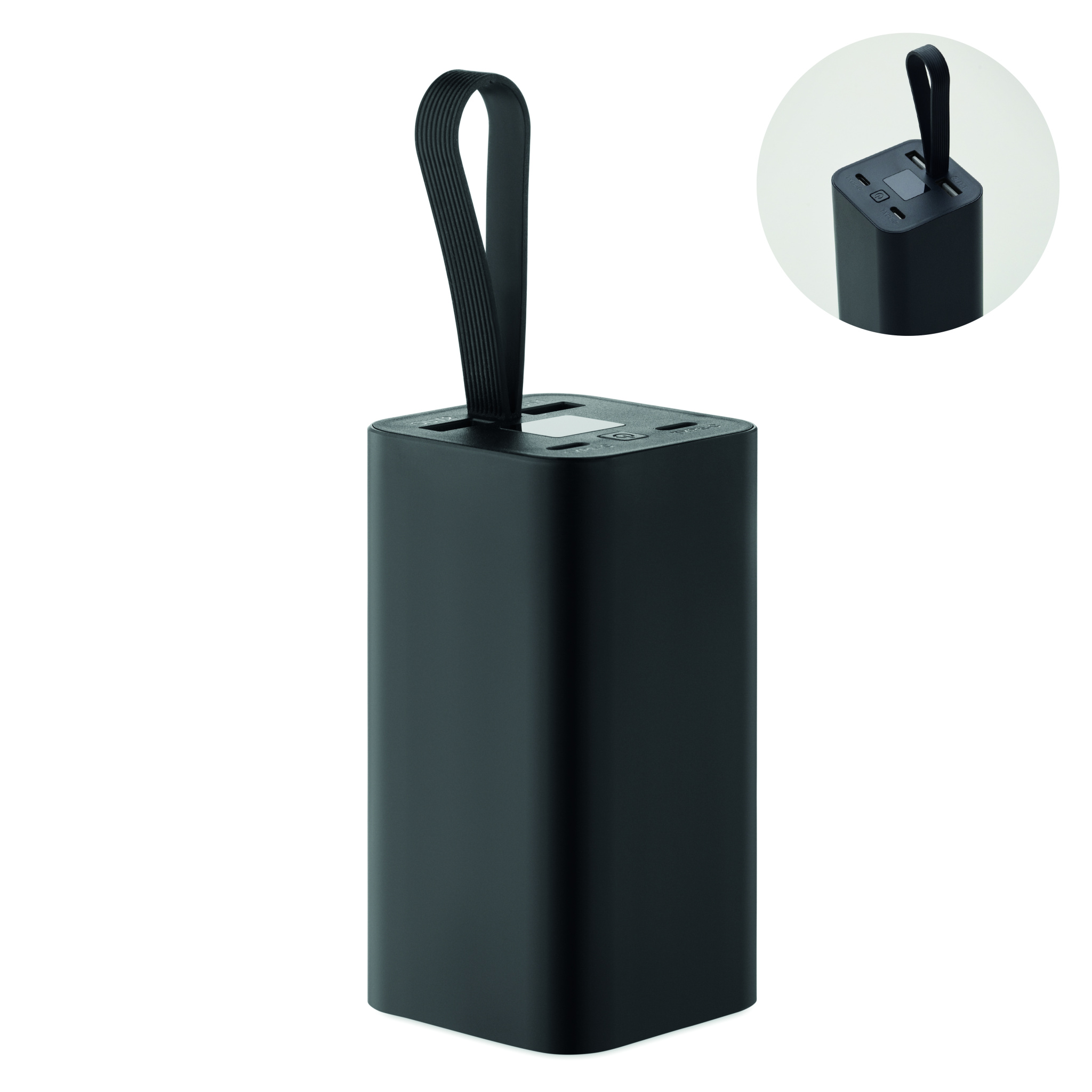 Powerbank 20.000 mAh aus recyceltem Aluminium. Digitale Leistungsanzeige und Schlaufe aus Silikon. Inkl. zwei Typ-C- und zwei USB-A-Ausgänge mit PD 65W-Schnellladefunktion.