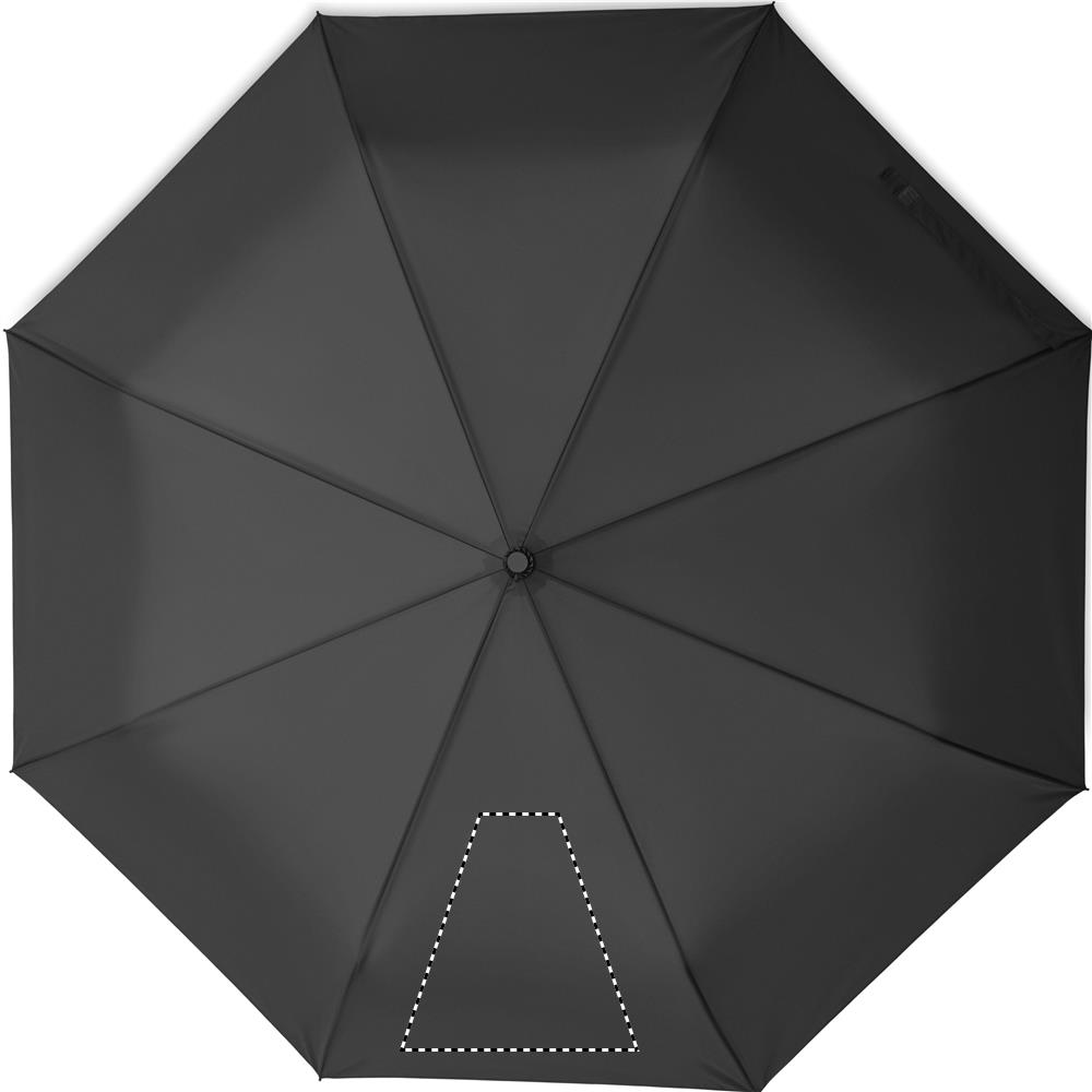 27' ' Regenschirm aus 190T Pongee-Material. Windbeständig. Gestell aus schwarz überzogenem Stahl, Schienen aus Fiberglas. 1-teilige schwarze Innenverkleidung. Schwarzer PP Griff mit Knopfdruckmechanismus. 3fach faltbar. Passende Schirmhülle. Automatische Öffnung und Schließung.