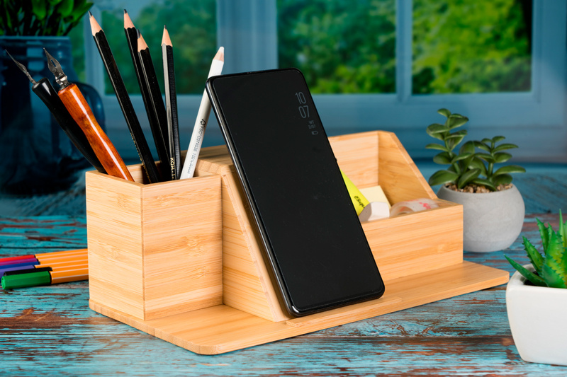Schreibtisch-Organizer aus Bambus mit 10 Watt Induktionsladestation, Ablagefach, Stifthalter und Ladekabel (Notizblock ist nicht im Lieferumfang enthalten). Ihre Werbung wird auf dem Organizer eingraviert. Die natürliche Bambusmaserung macht jedes Teil und jede Gravur zu einem Unikat.