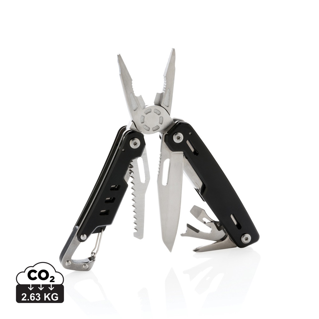 Multitool im Aluminium-Case mit 11 Funktionen aus Stainless Steel wie z.B. eine Zange, Messer, Schraubendreher, Säge, Dosenöffner, Karabiner und vielem mehr. In Geschenkbox verpackt.