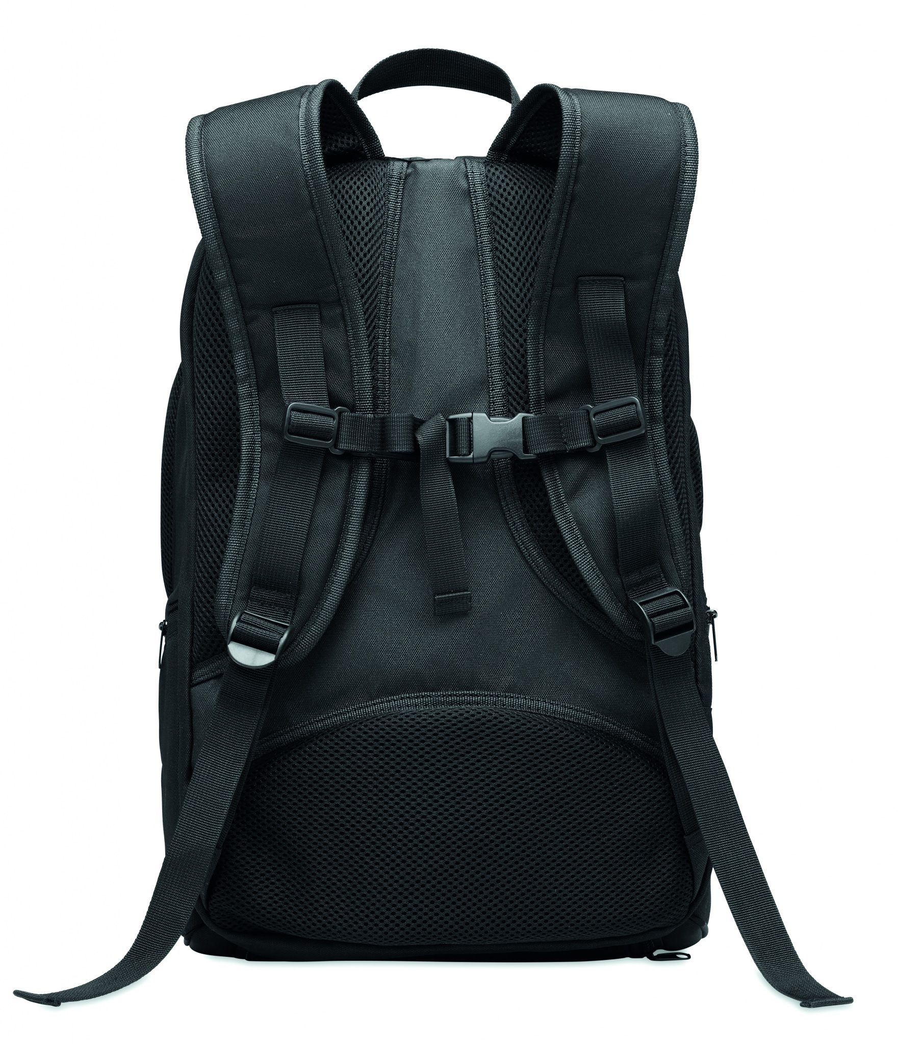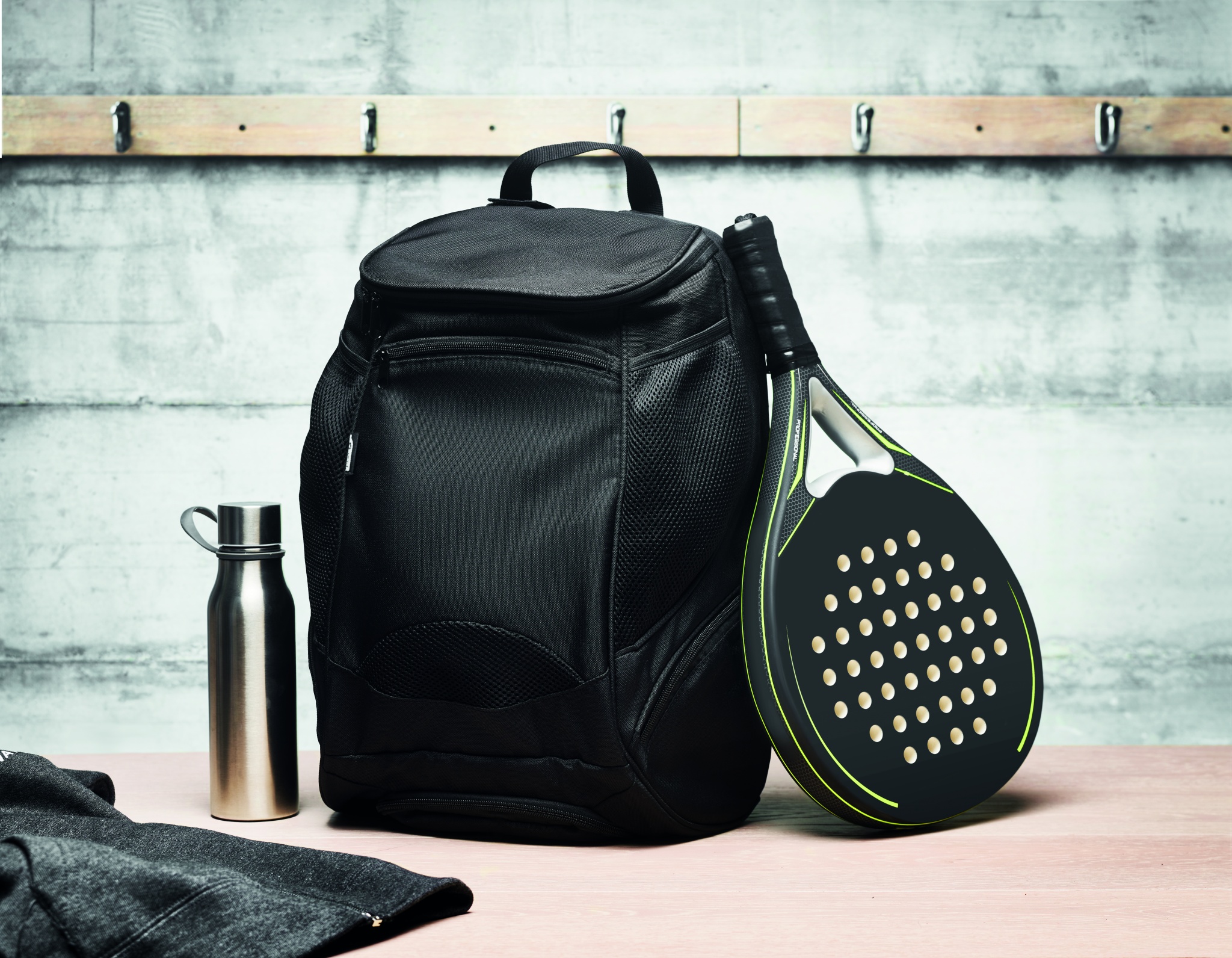 Multifunktionaler Sportrucksack 600D RPET. Mehrere Fächer und gepolstertem Fach für Padelschläger. Verstellbarer Schultergurt.
