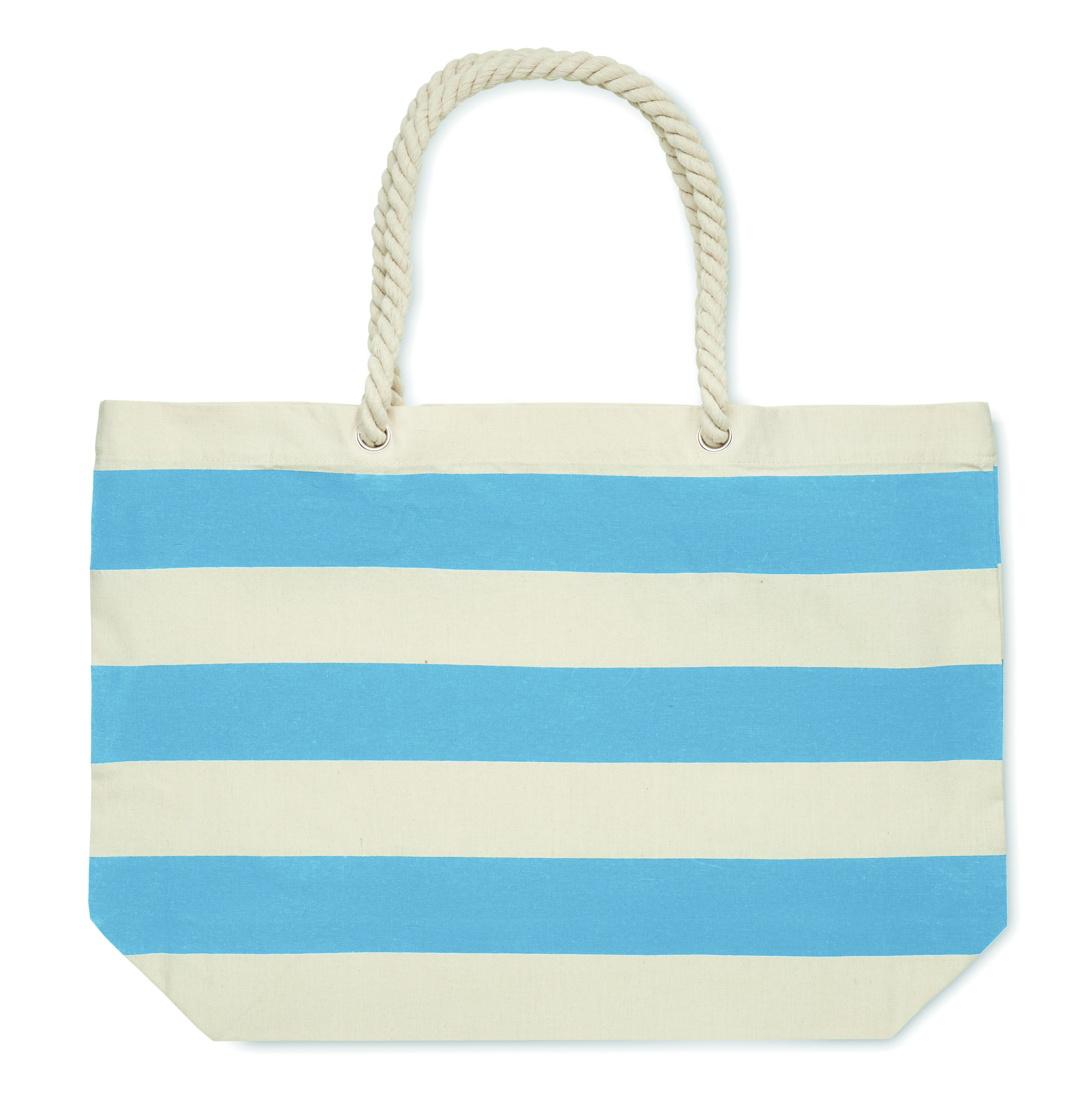 Gestreifte Strand- oder Einkaufstasche. Baumwolle 220 g/m² mit Kordelgriff.