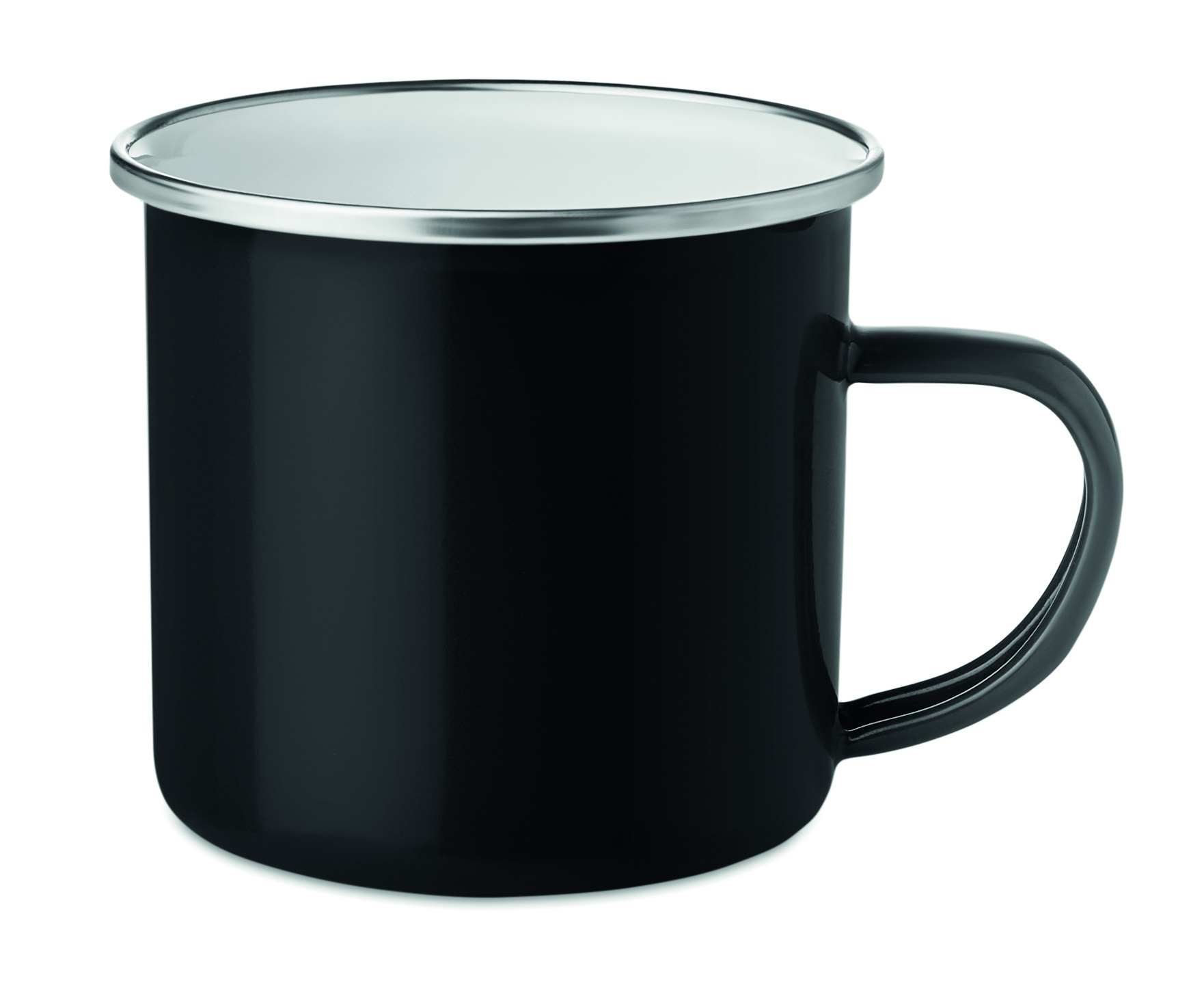 Emaillierter Metall-Becher im Vintage-Look. Füllmenge: 350 ml. Bitte beachten: Keine Drucktechnik ist spülmaschinengeeignet, auch Keramik-Transferdruck nicht.