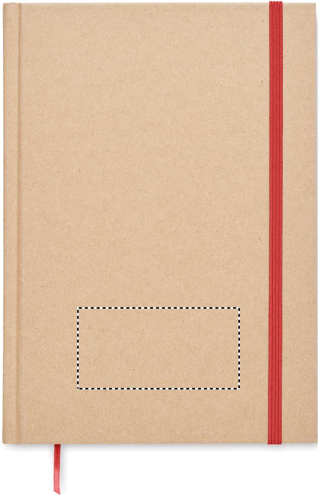 A5 notebook with hard recycled carton cover. Casebound. 200 lined recycled paper pages (100 sheets/80 gsm). Elastic closure strap and ribbon page-marker. Made in EU.