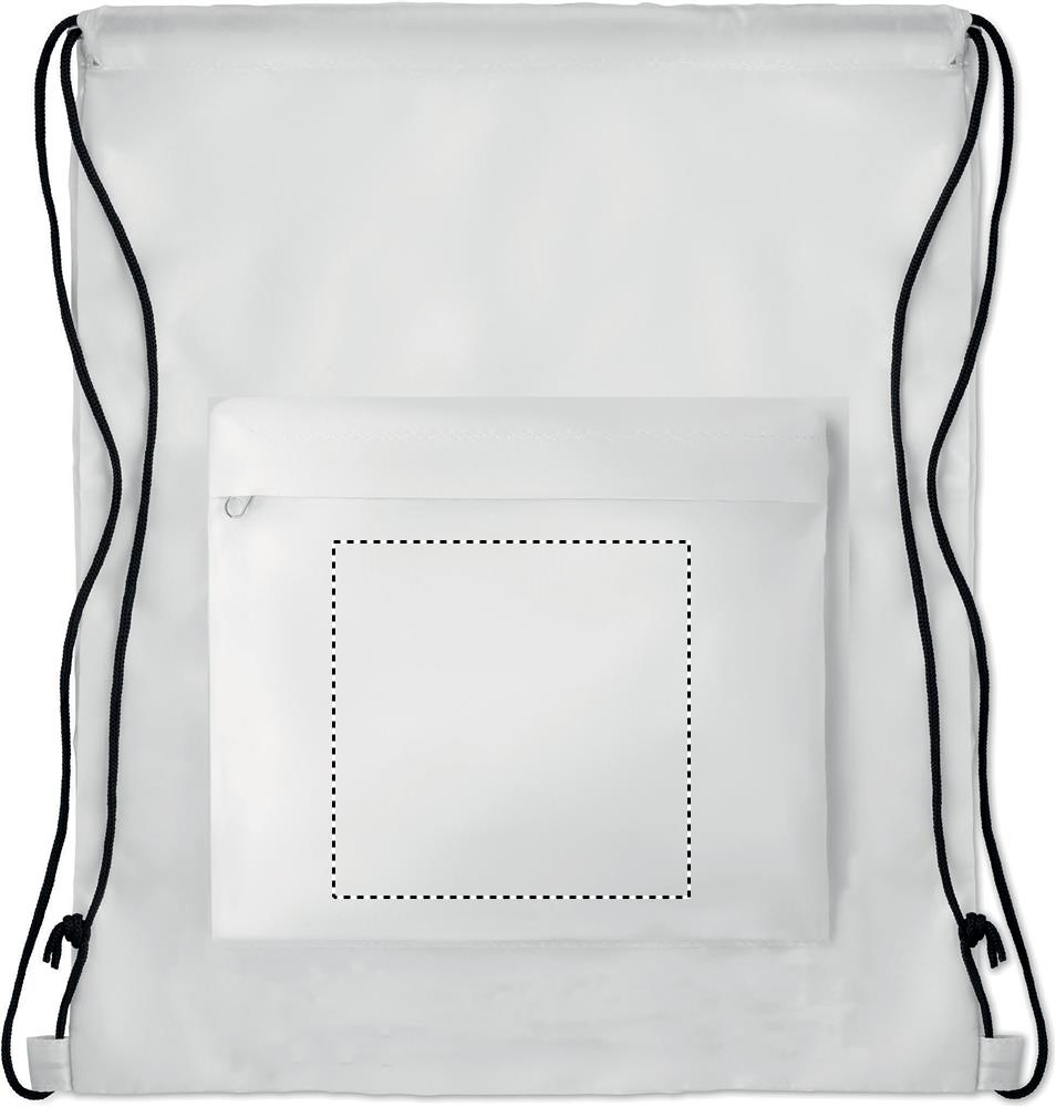 Large drawstring bag in 210D polyester with zippered front pocket.