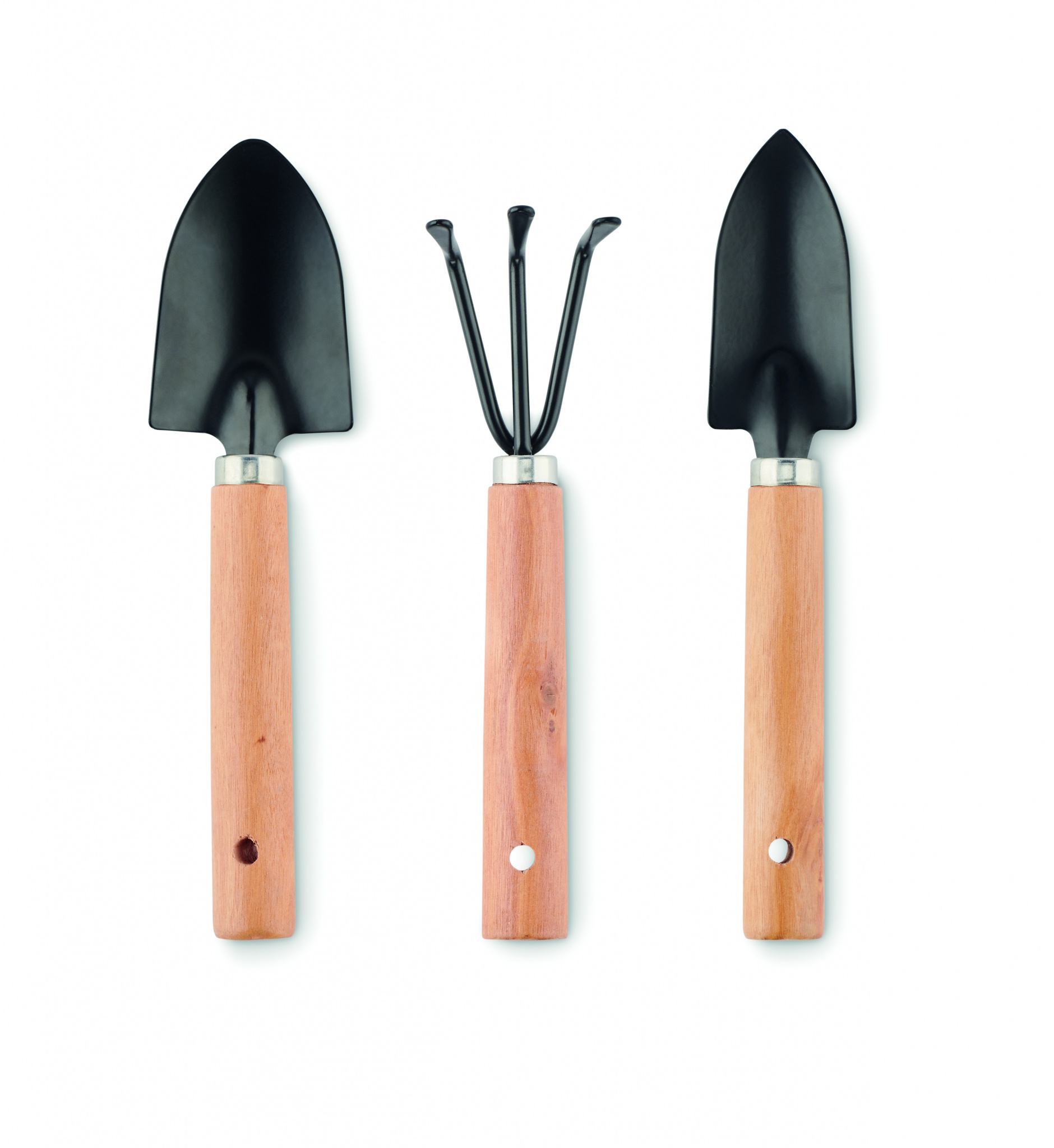 Set of 3 garden tools. Harrow and 2 spades. Presented in RPET felt pouch with hook and look closure.