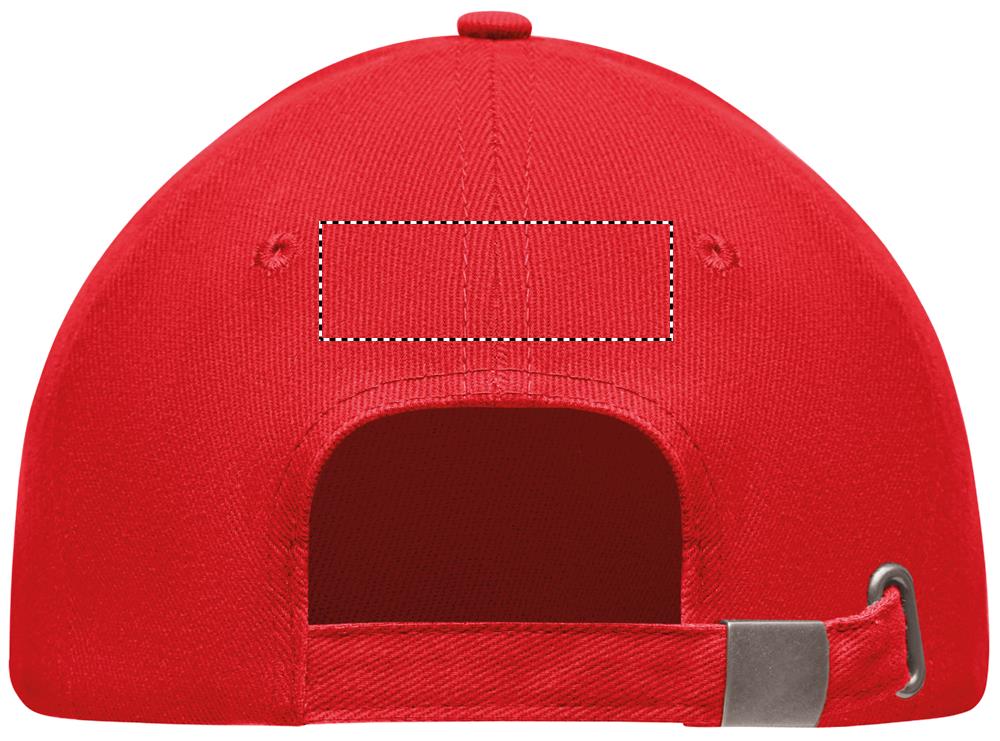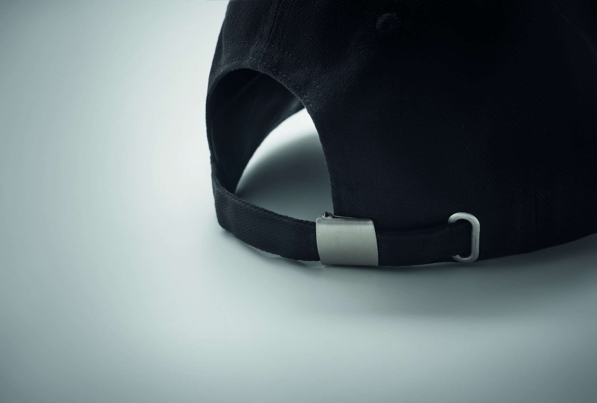 5 panel baseball cap in heavy brushed twill cotton 260 gm/m2 with silver steel buckle. 4 embroidered eyelets in matching colour. Size 7 1/4.
