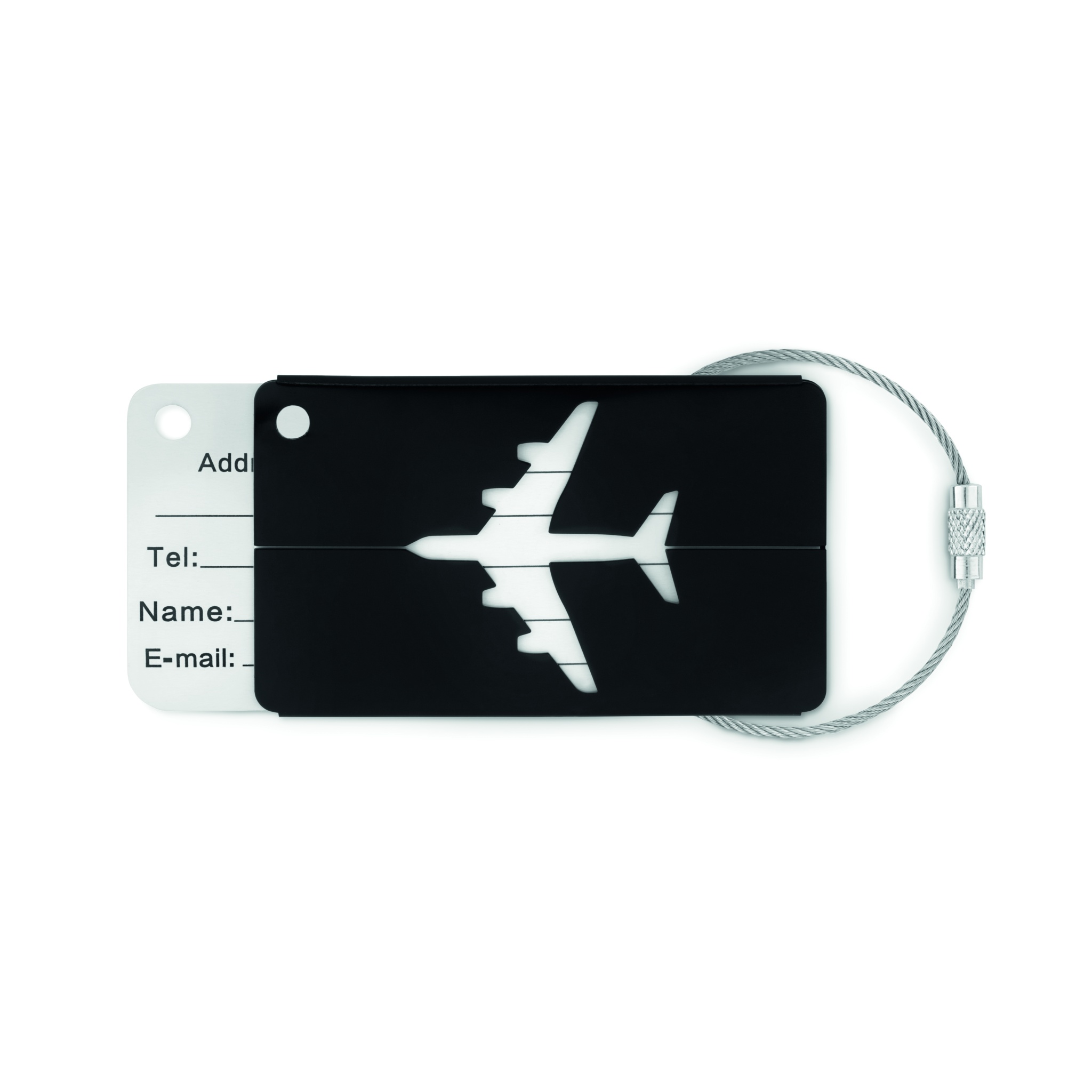Aluminium airplane luggage tag with name and address label. Comes with metal string and screw connector.