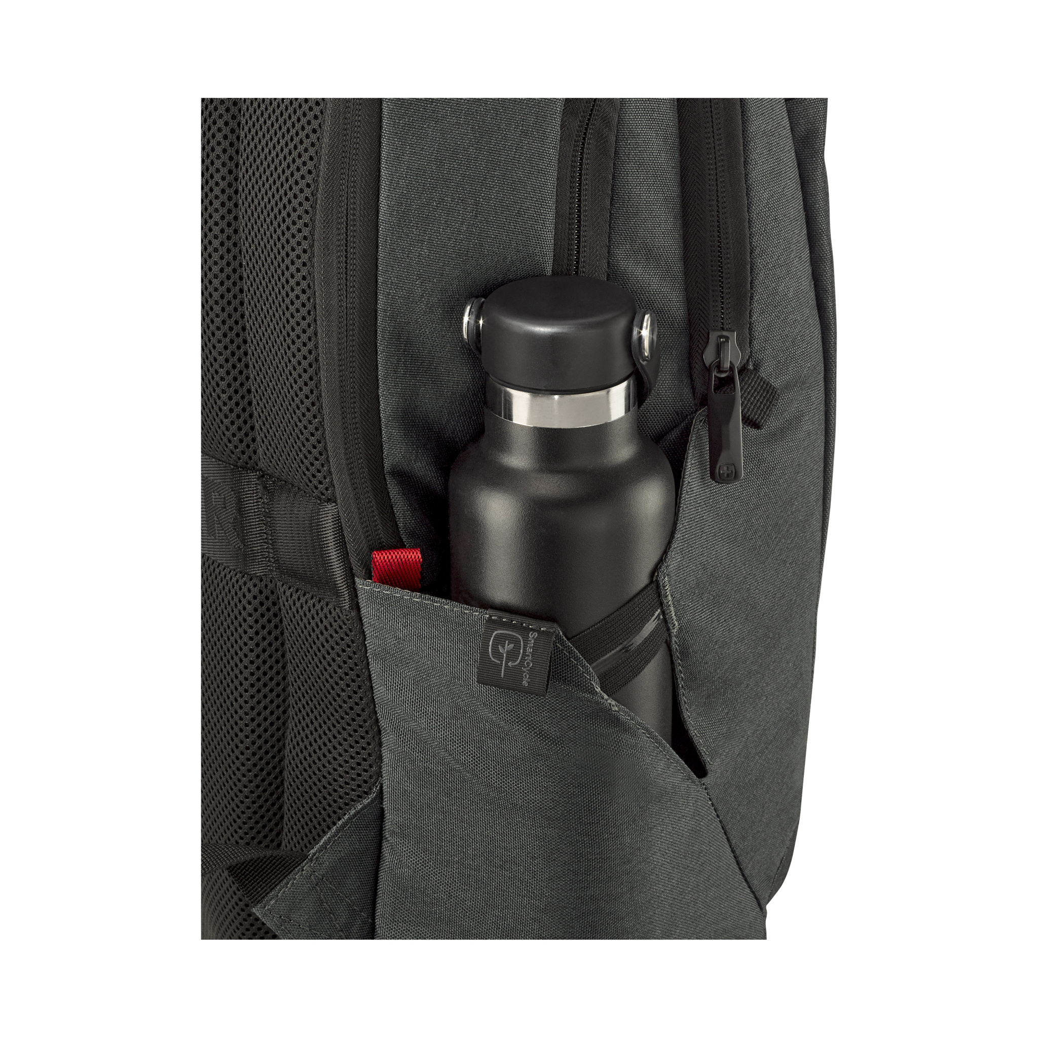 The backpack has a dedicated compartment for a 16 `laptop and a 10` tablet, an organizer for keeping things tidy and side zip pockets. The backpack has a Pass-Thru sleeve that allows you to slide the backpack on the handle of the suitcase, which is perfect for traveling and an S / R buckle to protect against theft. The outer material of the bag is made of recycled PET bottles.