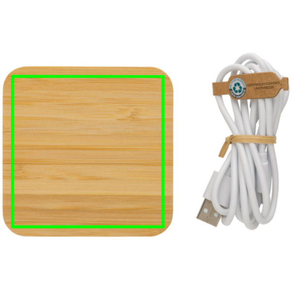 Fast 10W wireless charger with FSC® 100% bamboo exterior. Including two USB ports at the front. Wireless charging compatible with Android latest generations, iPhone 8 and up. Item and accessories PVC free. Including 150 cm type C charging cable made from RCS certified recycled TPE. Packed in FSC® mix kraft box. Type-C in; Input 5V/2A; 9V/2A; Wireless output 5V/1A;9V/1.1A (10W) USB A output: DC5V/2A