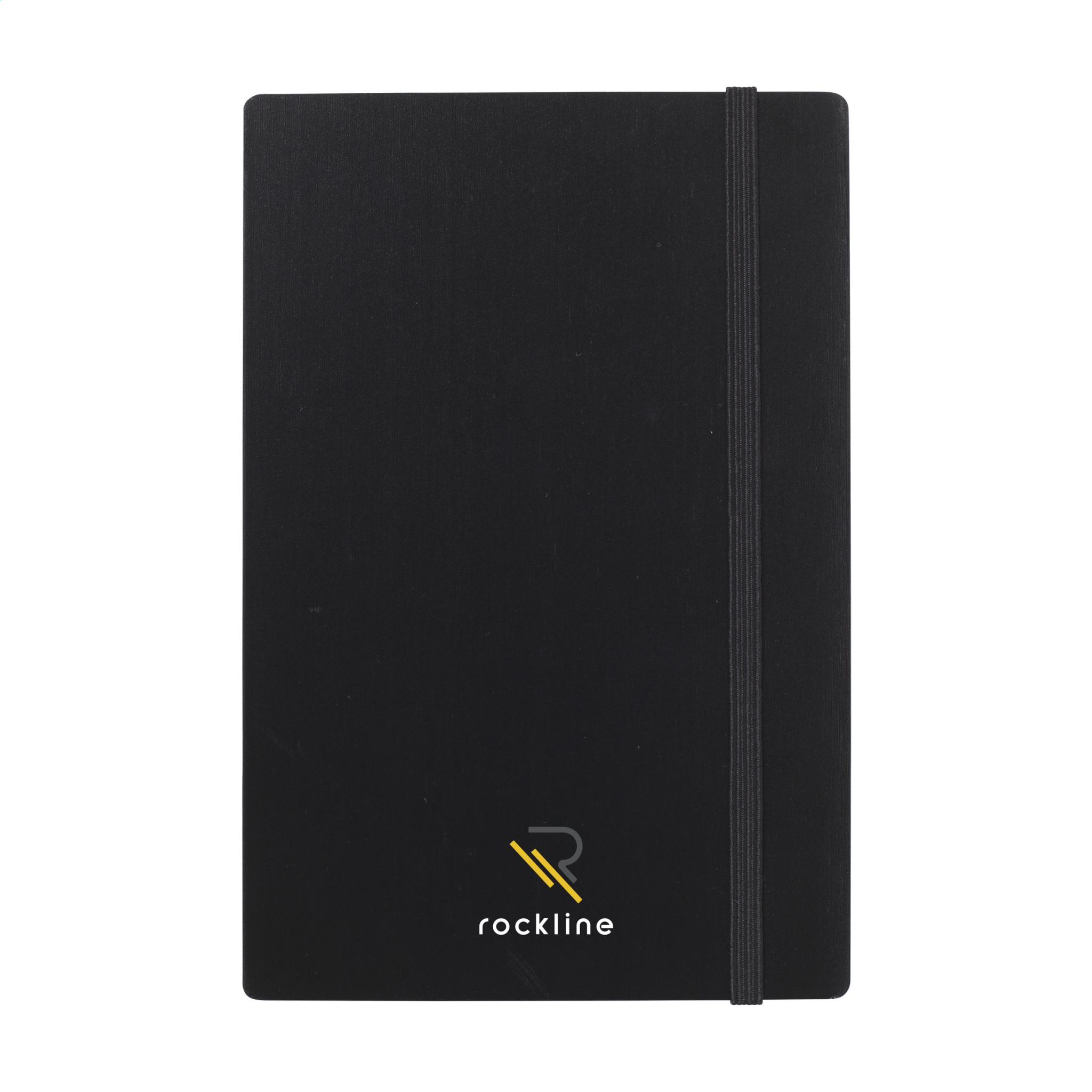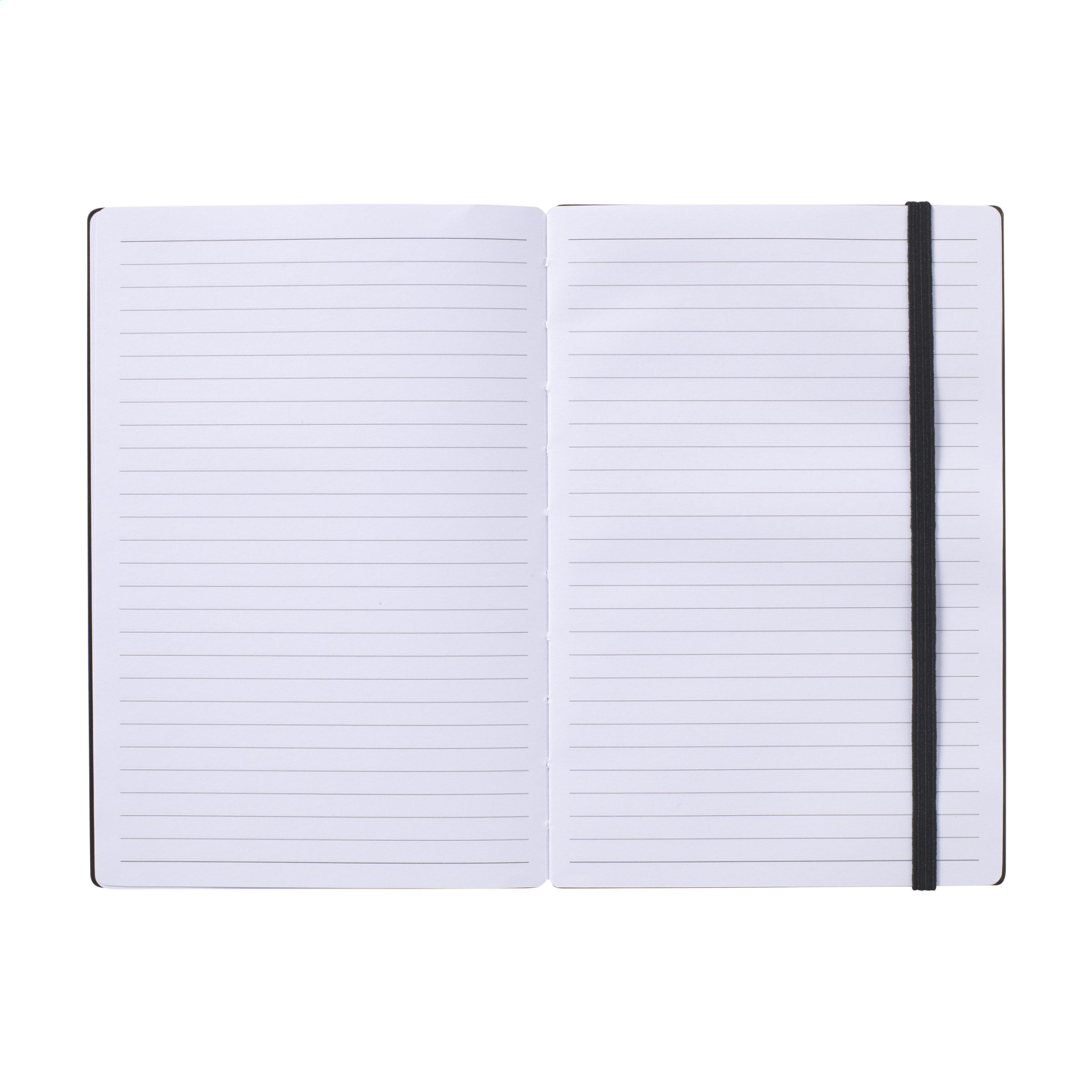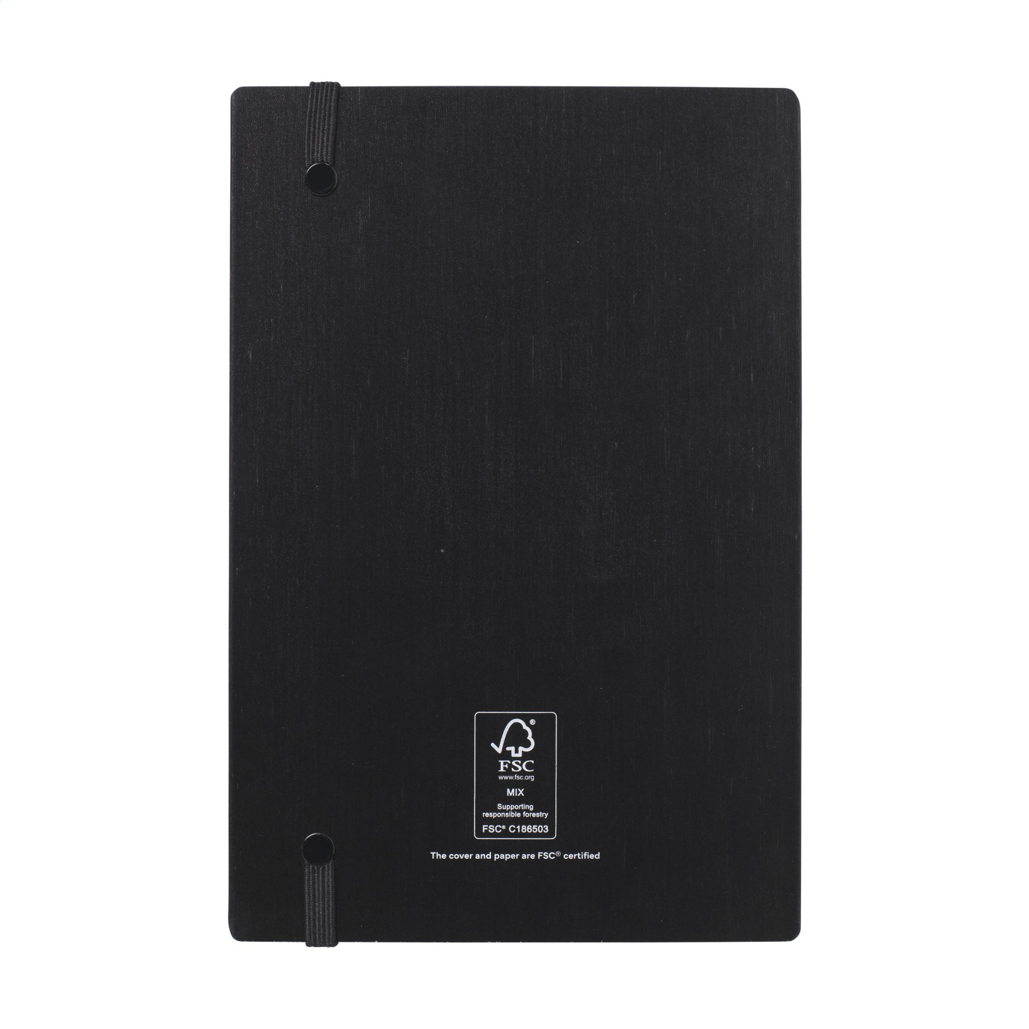 A5 size notebook with sturdy, black-lacquered FSC 100% certified bamboo hardcover. With a naked spine binding. This feature is specially designed to have the open notebook lay as flat as possible. This makes it much easier to take notes and sketch. With elastic closing and approx. 96 sheets/192 pages of white, lined, FSC Mix certified paper.