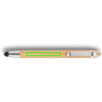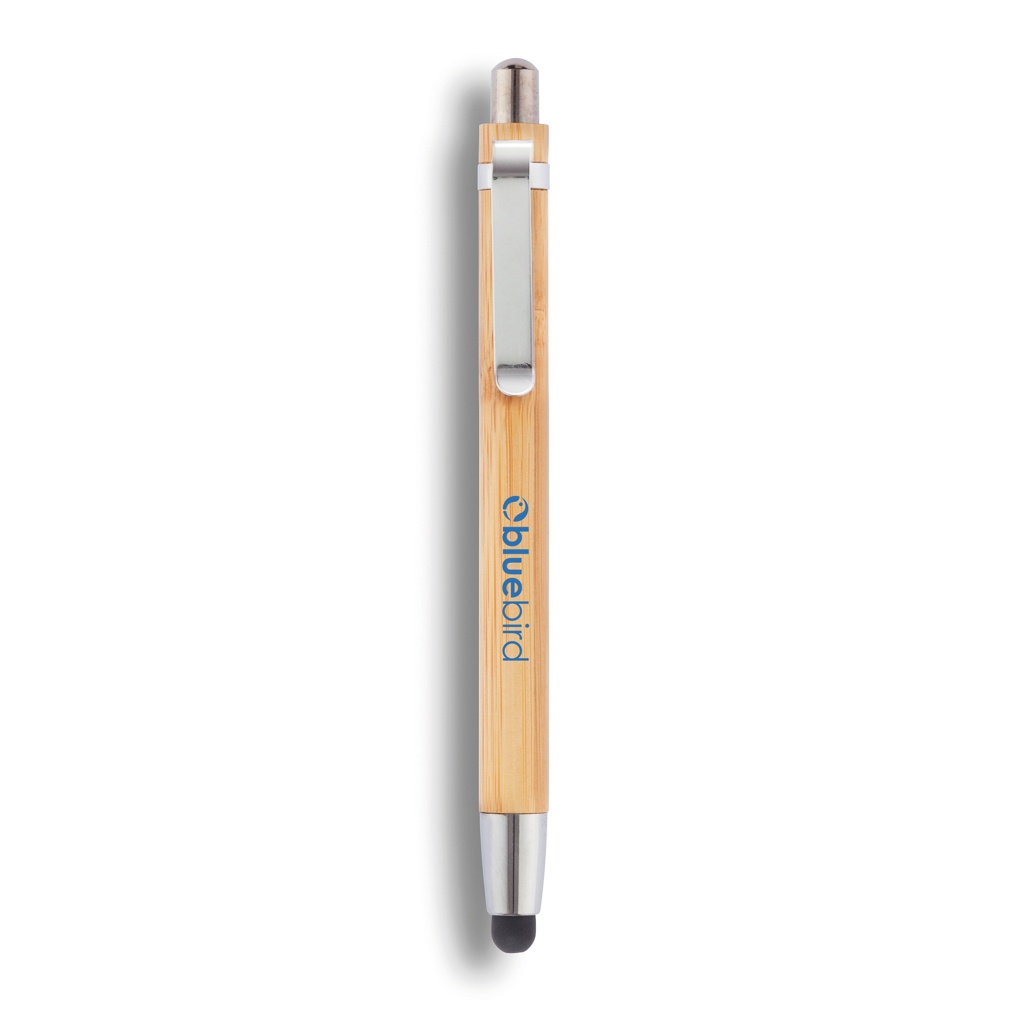 Bamboo touch pen with integrated stylus tip and ballpoint.
