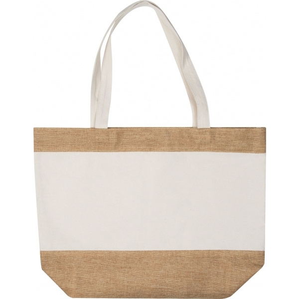 Eco-friendly beach bag made of cotton and jute with long handles. Everything for your beach trip fits in here. Your logo will be printed on one side.