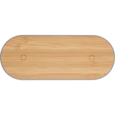 Slim plastic charging station with bamboo surface and two induction charging points for smartphones, including a charging cable. Your logo will be engraved on the station.