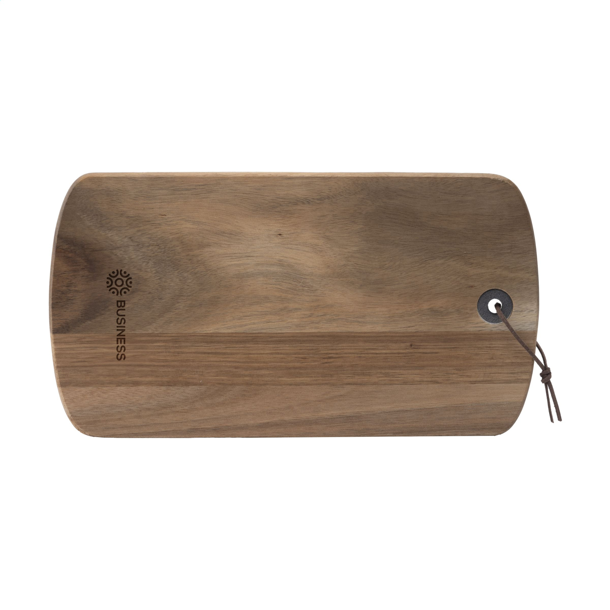 Cheese board made from acacia wood, a robust type of wood with a warm appearance. With leather cord. Includes 2 cheese knives and 1 cheese fork. A beautiful set for serving different types of cheese. Each set is supplied with a cardboard sleeve.