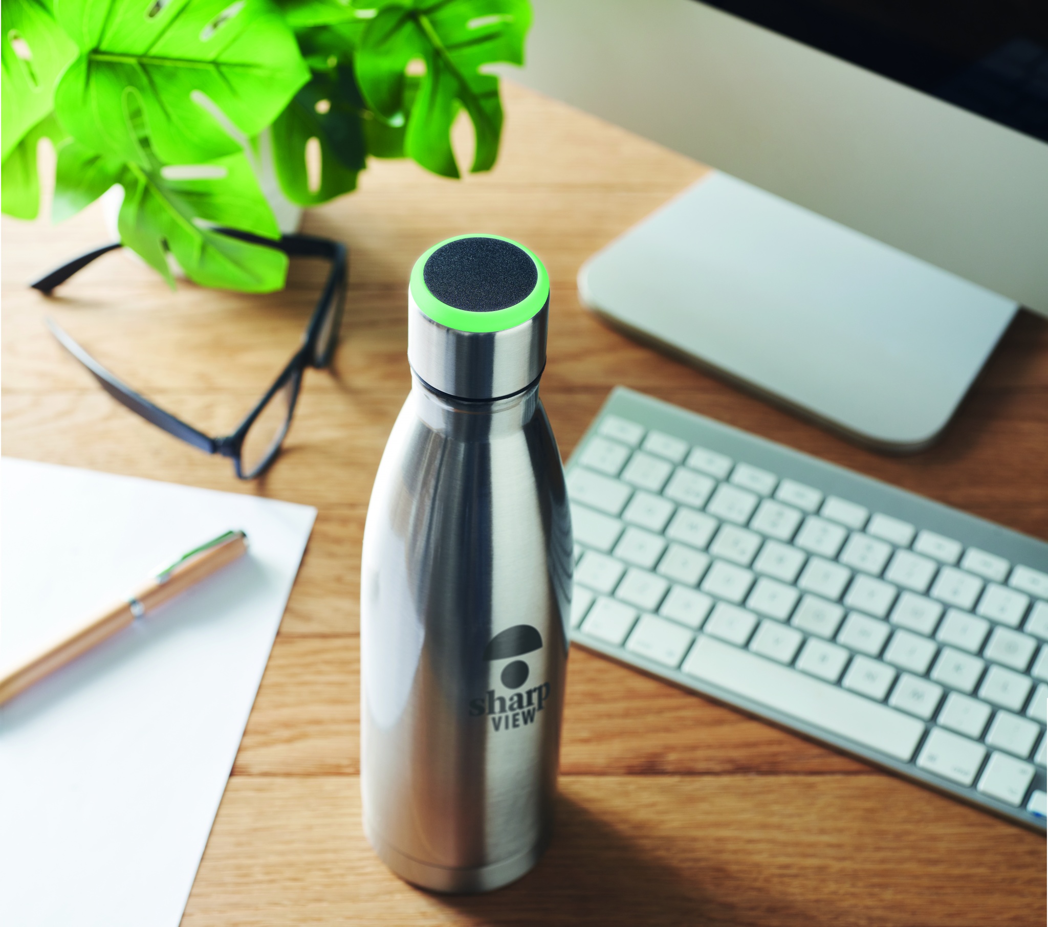 Double wall stainless steel bottle with hydration reminder. Sensor light glows every hour reminding you when it is time to drink. Including 1 CR2032 battery. Capacity: 500 ml.