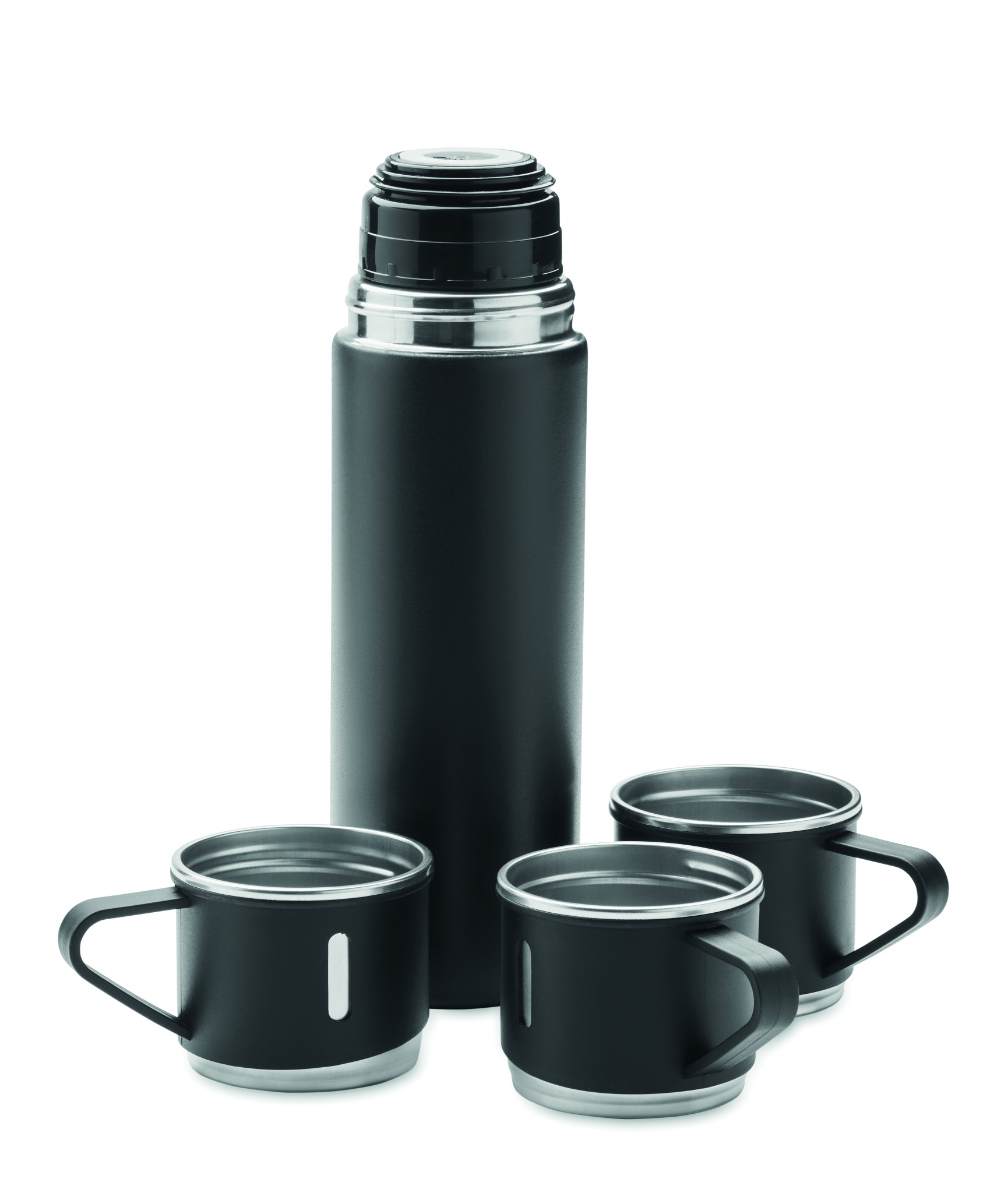 Set of double wall stainless steel vacuum insulated flask with leak-free cup lid and 2 additional cups. Capacity: flask - 420 ml, cup - 150 ml.