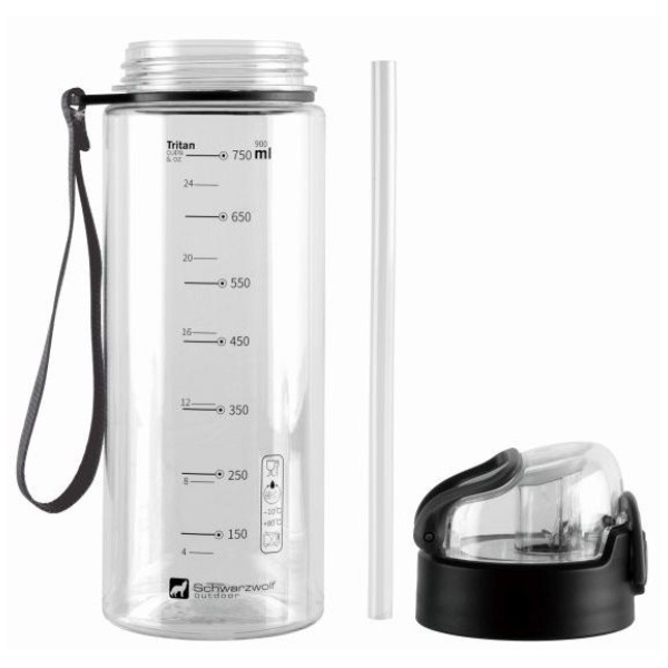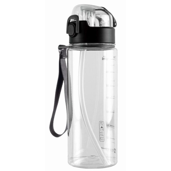 Sports bottle made of transparent tritan with 900 ml volume. The bottle has a black wrist strap and it doesn´t contain BPA. It is suitable for cold and warm drinks from -10°C to 80°C.