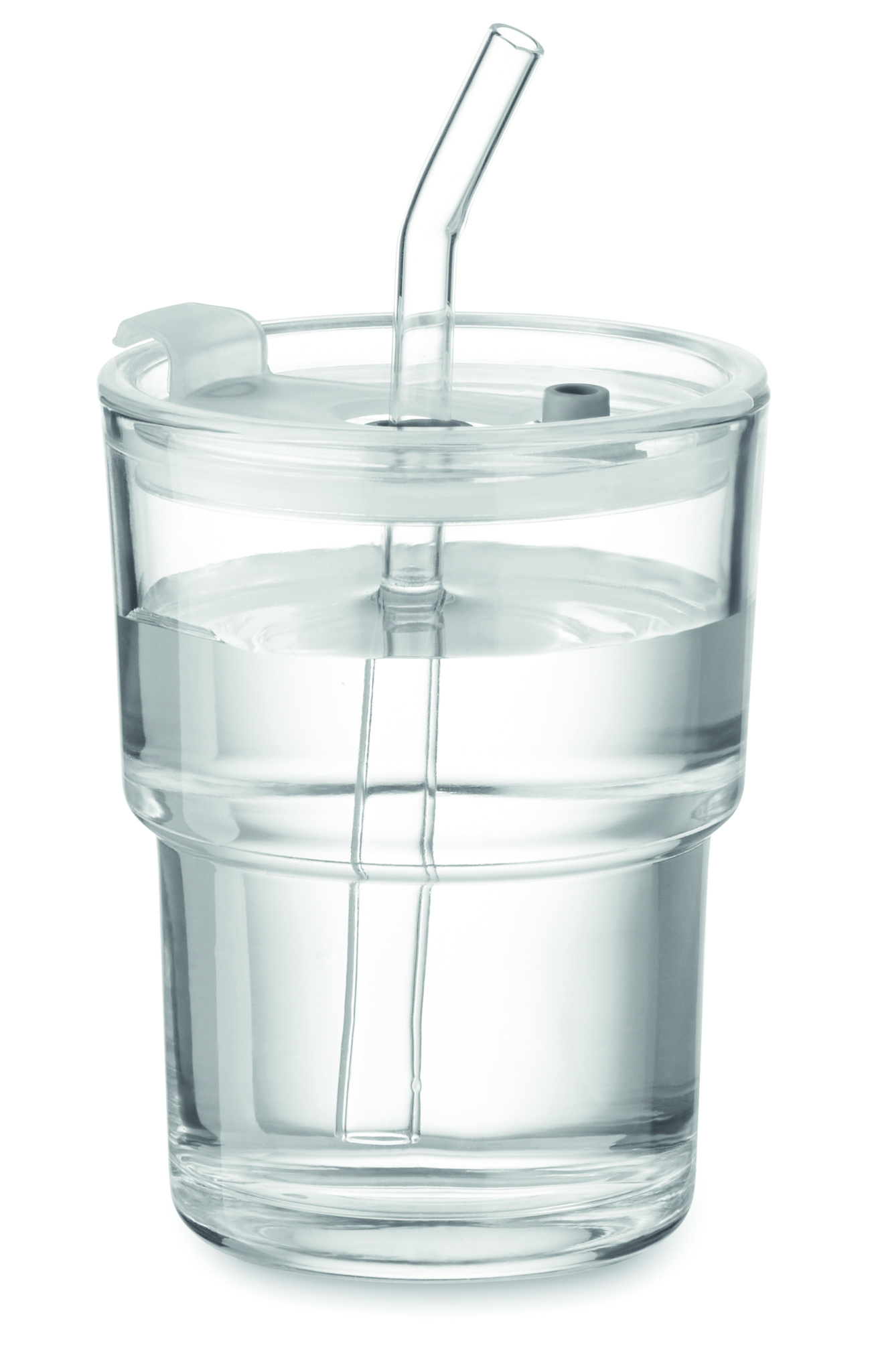 Glass tumbler with lid including removable glass straw. Straw socket and direct drink opening leak-free lid. Capacity 400 ml.