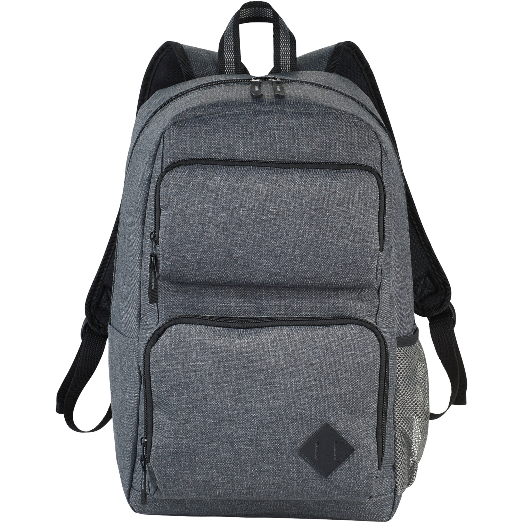 Zipped main compartment with padded laptop sleeve holds up most 15.6" laptops and has a dedicated tablet pocket with room for all your other business essentials. The two front pockets offer flexible decorating locations and are large enough for power banks, cables, and other essentials. The side pocket offers additional storage. Adjustable padded backpack straps and top grab handle. There may be minor variations in the colour of the actual product due to the nature of the fabric dyes, weaves, and printing.