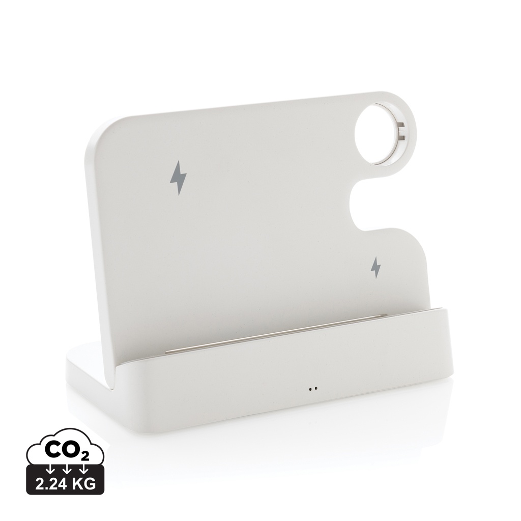Foldable design charging stand with 15W wireless charger made with recycled ABS. With second 5W wireless charger to charge smaller objects like earbuds. With iWatch slot to fit the official charging cable for iWatch. On the backside there is a 5V/1A USB A and USB C output port to charge items by cable. With silicon tips on the bottom to avoid slipping and silicon cushioning to the stand to keep your phone in perfect condition. Total recycled content: 80% based on total item weight. RCS certification ensures a completely certified supply chain of the recycled materials. Packed in FSC® packaging. PVC Free. Including RCS recycled TPE 120cm USB A to USB C charging cable. Packed in FSC® packaging. PVC Free