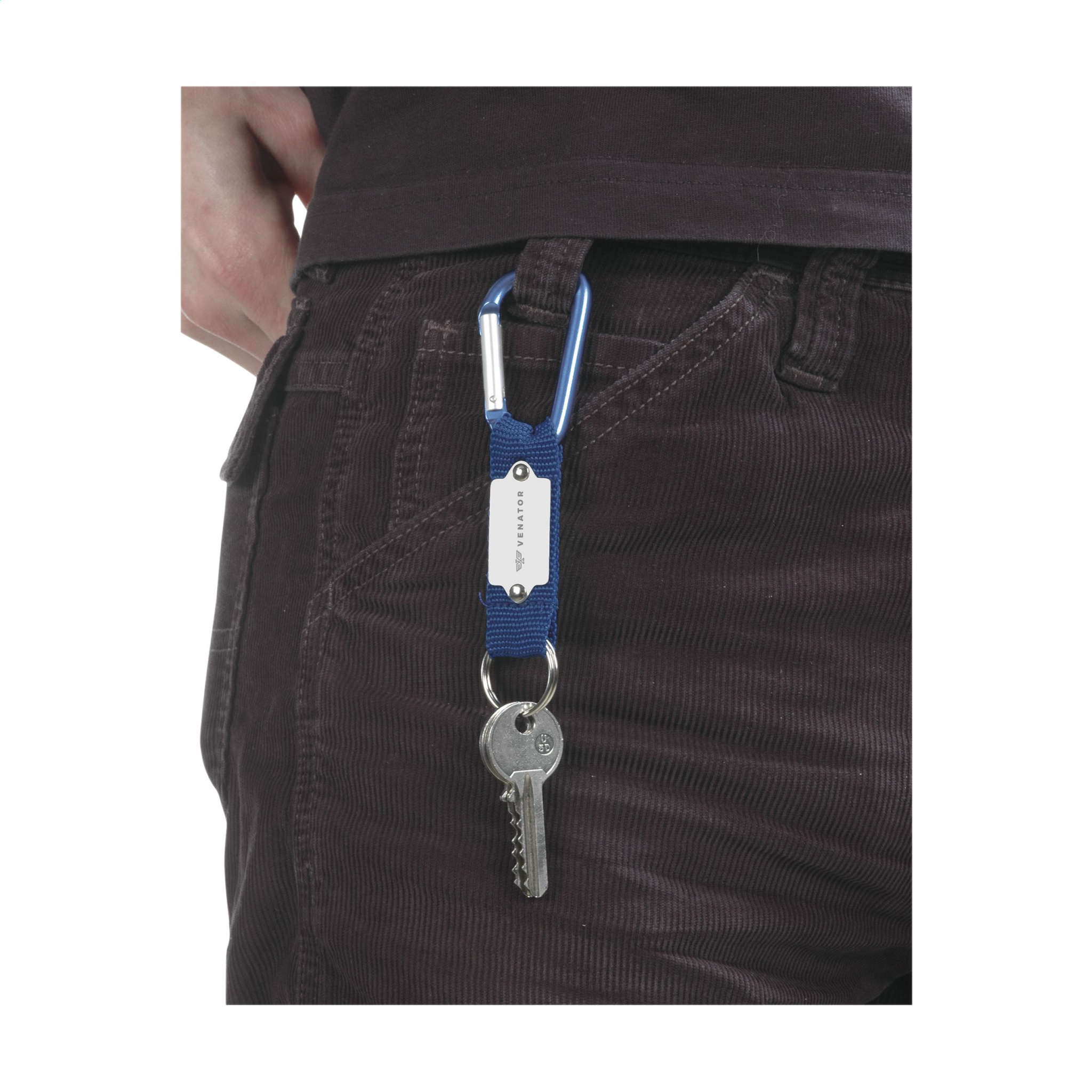 Carabiner hook with woven nylon strap and sturdy keyring.
