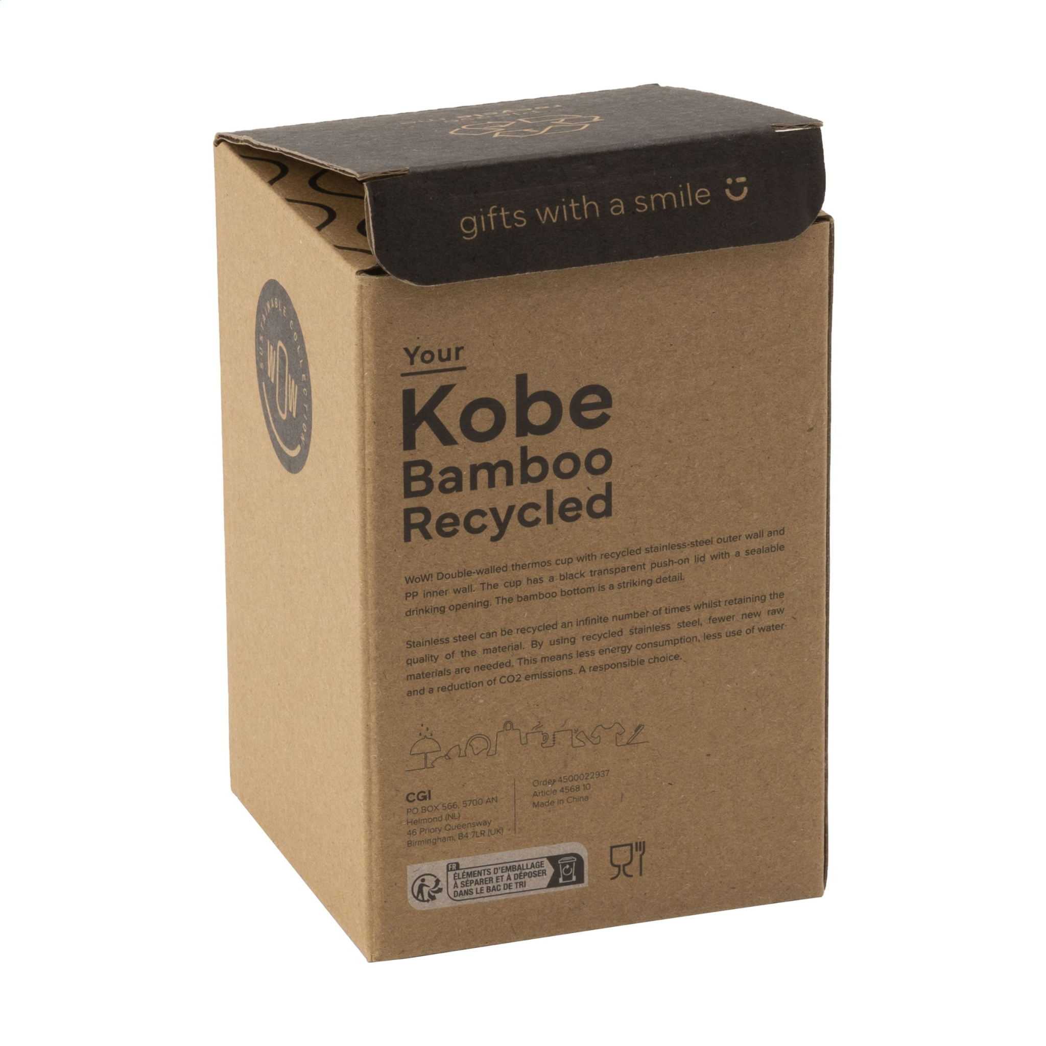 WoW! Double-walled thermos cup with recycled stainless-steel outer wall and PP inner wall. The cup has a black transparent push-on lid with a sealable drinking opening. The bamboo bottom is a striking detail, with a thickness of 1.5 cm. RCS-certificated. Total recycled material: 38%. Capacity 350 ml. Stainless steel can be recycled an infinite number of times whilst retaining the quality of the material. By using recycled stainless steel, fewer new raw materials are needed. This means less energy consumption, less use of water and a reduction of CO2 emissions. A responsible choice. Each item is supplied in an individual brown cardboard box.