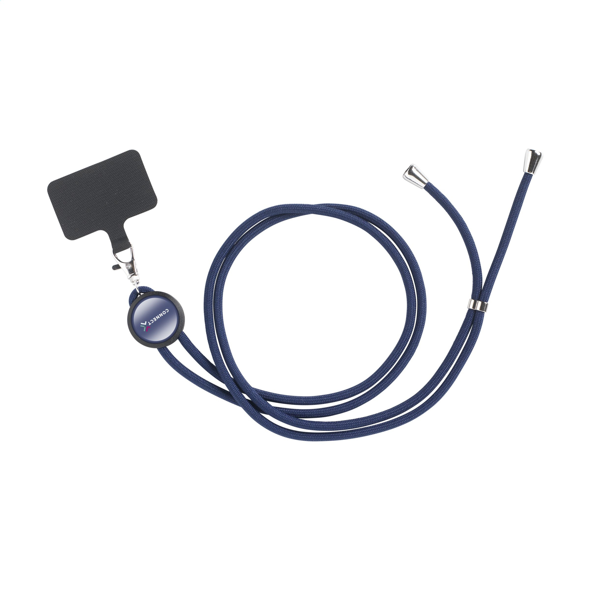 Adjustable phone lanyard with round cord made from 100% GRS RPET polyester. With metal carabiner, aluminium adjustable loop and stoppers and a round tag made of recycled plastic. The universal patch makes it possible to attach your smartphone to your lanyard. With this combination, you can carry your smartphone safely around your neck. This ensures that you have your phone quickly at hand and you can keep your hands and clothing pockets free. This patch is compatible with most smartphone and case combinations, but not with cases with an open bottom. The system is designed so that your phone's charging port is not blocked. GRS-certified. Total recycled material: 40%.