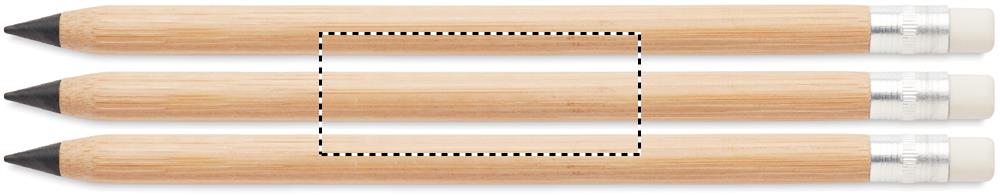 Long lasting bamboo inkless pen with bamboo barrel and eraser on top with a paper cap. The pen writes with the graphite tip. This makes this pen a great sustainable alternative to the traditional pen. Bamboo is a natural product, there may be slight variations in colour and size per item, which can affect the final decoration outcome.