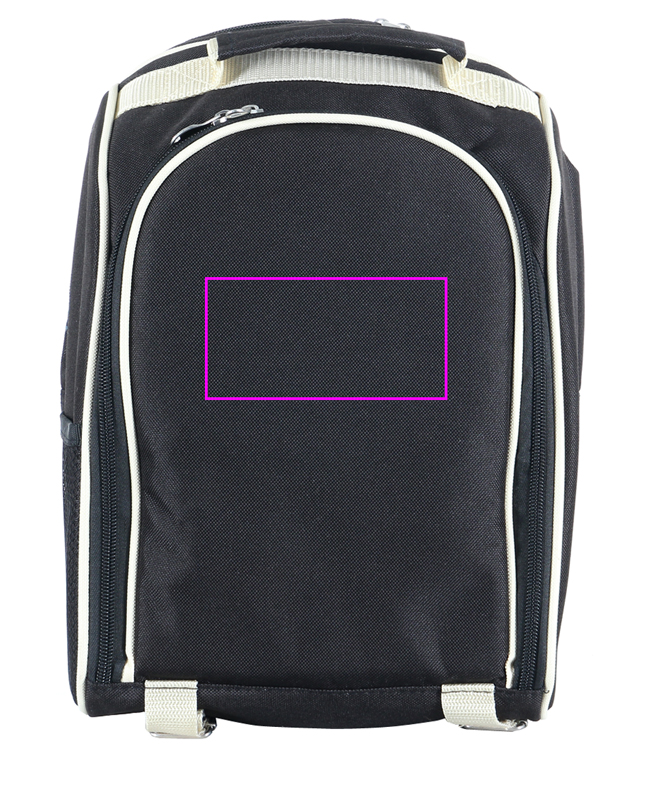 Luxurious picnic backpack. The high-quality robust outer material made of polyester and its compactness make it a really amazing item. But it provides even more: a cooling compartment on the back and a spacious inner compartment including excellent equipment like, a stainless steel isolating flask with 1l capacity, two 0,2l stainless steel cups, stainless steel salt and pepper shakers, a snack tray, cutlery and napkins. We will put your logo on the front compartment.