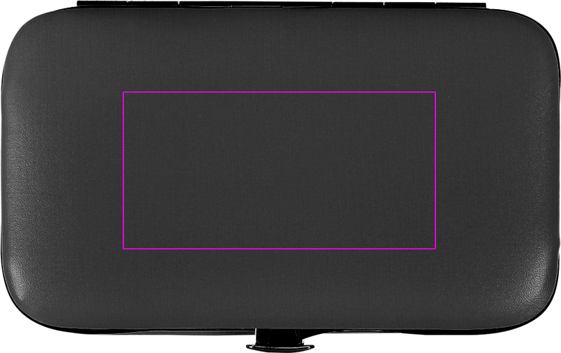 Manicure set in PVC case with metal frame including nail scissors, nail file, nail clippers and tweezers. We print your logo on the case.