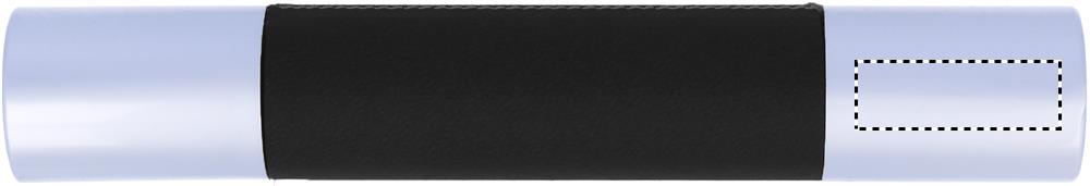 Metal ball pen with silver chrome finish and PU leather application in aluminium tube box. Black ink.