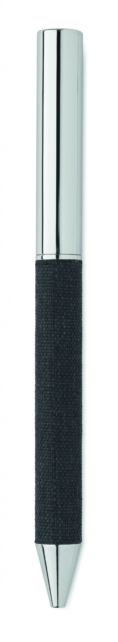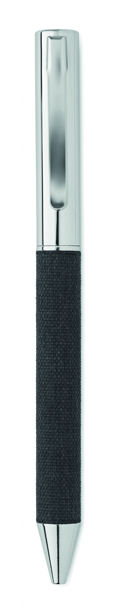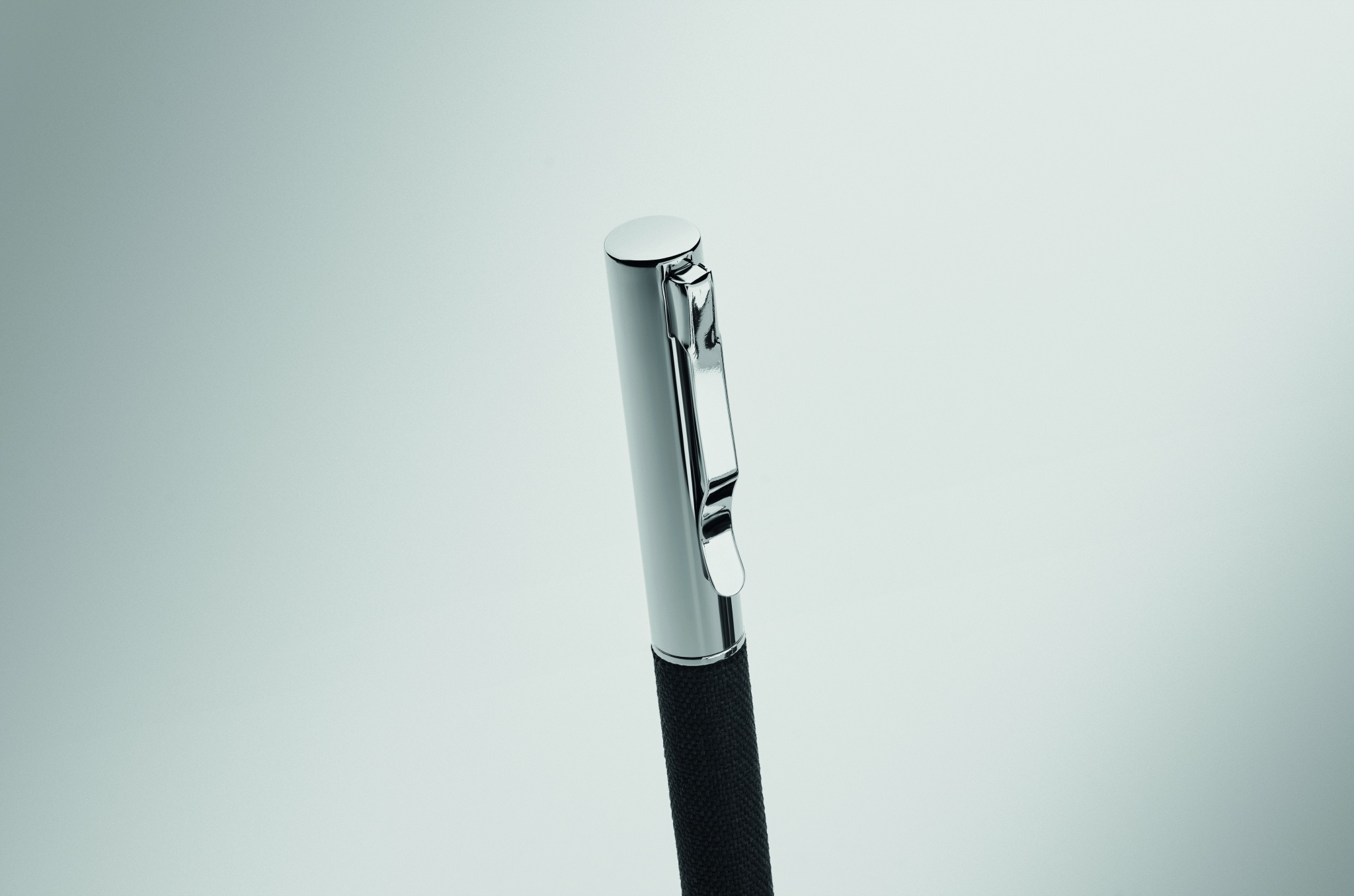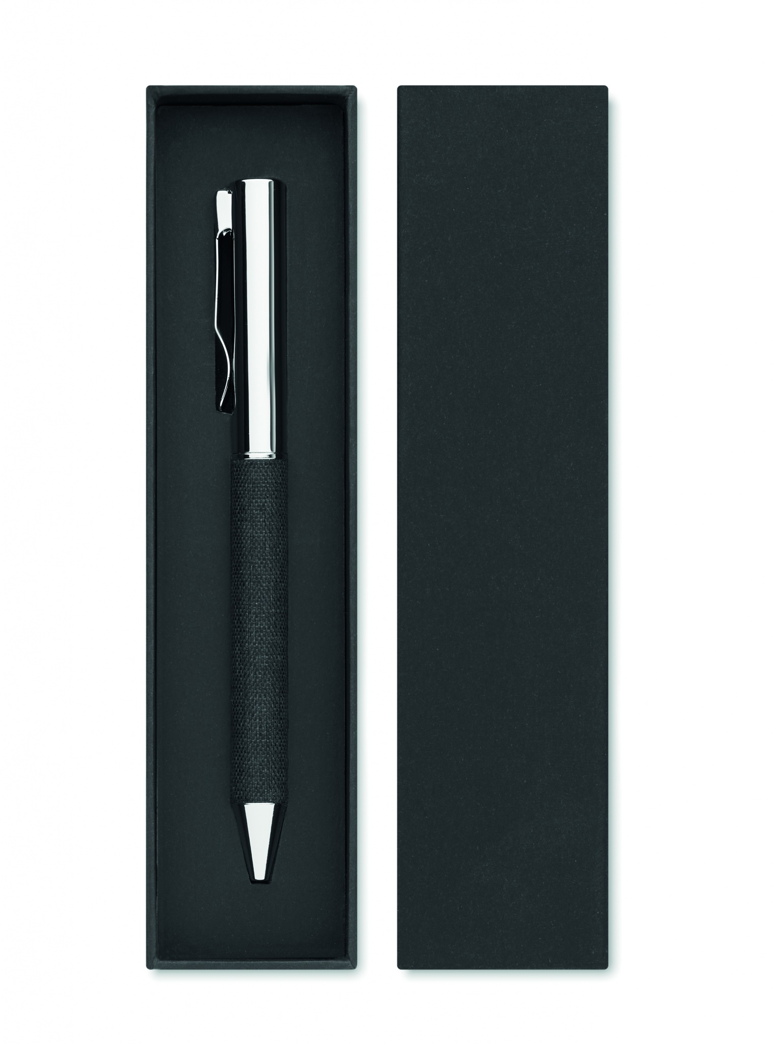 Metal twist ball pen with RPET polyester detail presented in gift box. Blue ink.