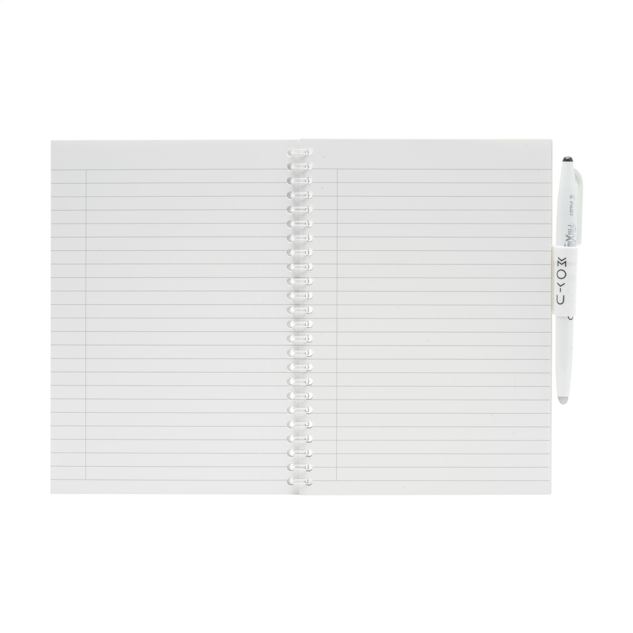 MOYU branded A5 erasable notebook made from stone paper. With bendable 400 gsm soft cover. This notebook includes a pen and cleaning cloth. Each stone paper page is sustainably produced, naturally tree-free and 100% recyclable. This notebook, with an elastic pen loop, is bound in a strong wire-o binding and has 18 pages lined paper. Take down notes with the accompanying, special MOYU pen. This pen contains the original Frixion ink. This special ink dries completely on stone paper and is easy to erase without leaving a trace. Slightly moisten the supplied MOYU cloth with some water and erase the ink. This way, pages remain empty for new ideas and to-do lists. You can write on rock paper 500 times on average. This notebook will last you for years. Stone paper is made from 80% limestone and 20% clean plastic. It is naturally tree free, and no water or chemicals are required to make it. The production of stone paper is therefore more economical and produces 67% less CO2 than in the production of pulp paper. In addition, stone paper can be recycled endlessly, without having to add new raw materials.