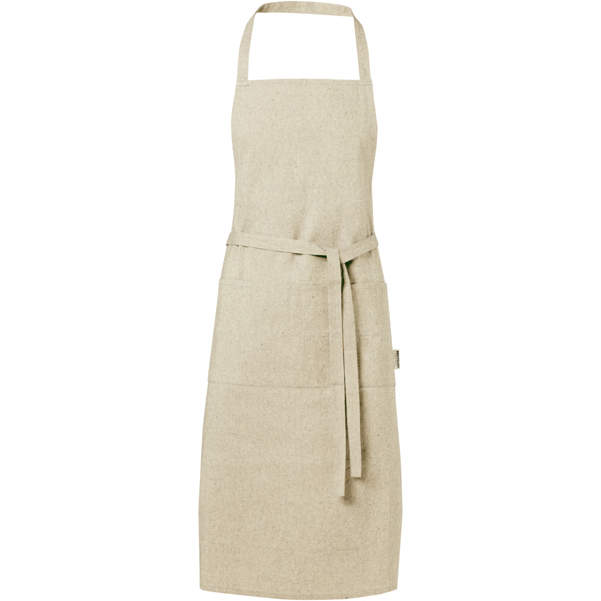 Apron made of 200 g/m² recycled cotton polyester blend. Features 2 adjacent pockets with a combined size of 45 x 20 cm, and a 1 metre tie back closure. Recycled cotton is manufactured from pre-consumer waste generated by textile factories during the cutting process. Due to the nature of recycled cotton, there may be a very slight colour variation. This feature distinctly adds to a more authentic appearance. Length of the neck strap: 55 cm.