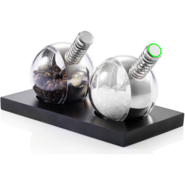 Planet is a stylish pepper and salt set that has a unique spring-action design in each grinder that allows convenient one-hand operation. As the globes are transparent it’s easy to see your sea salt and peppercorn levels. Registered design®