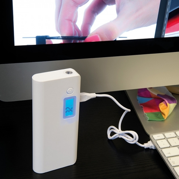 Power bank with a capacity of 10.000 mAH, USB charging cable and digital operation display to show the remaining power. You can recharge your smartphone several times with this plastic power bank. We will print your logo on the top.