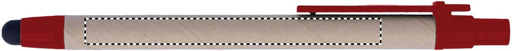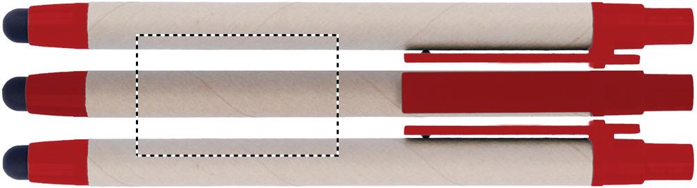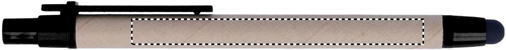Push ball pen made with recycled carton barrel and ABS point and clip. Blue ink, refill and soft touch tip.