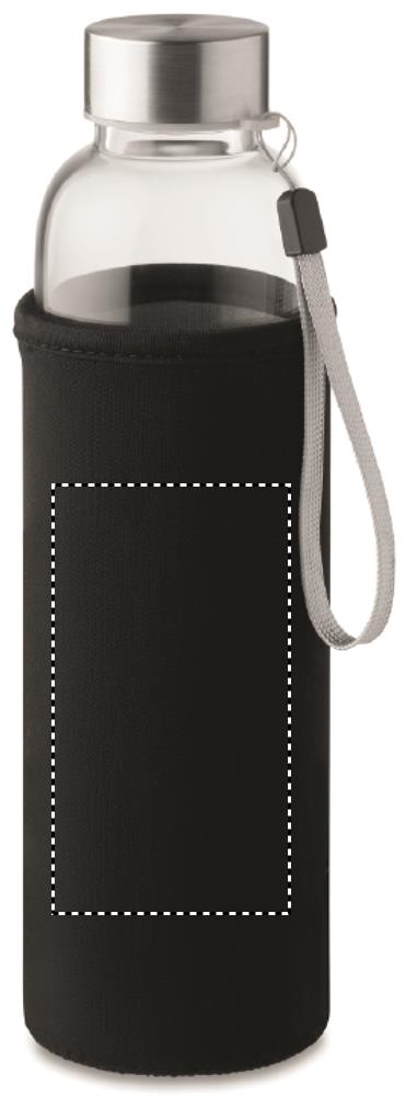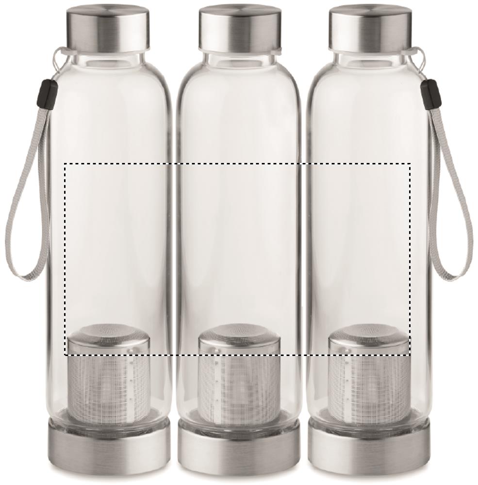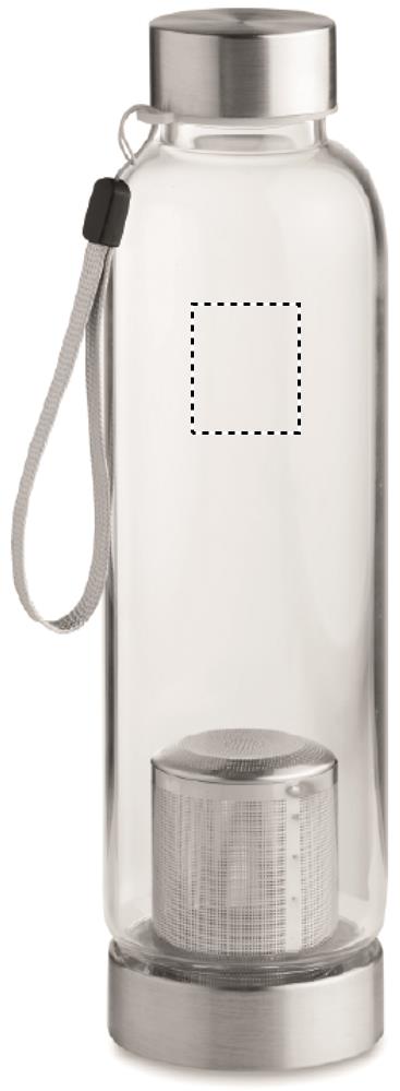 Single wall in high borosilicate glass bottle with tea infuser and neoprene pouch. Capacity 500 ml. Not suitable for carbonated drinks. Leak free. Laser engraving is not possible on borosilicate glass.