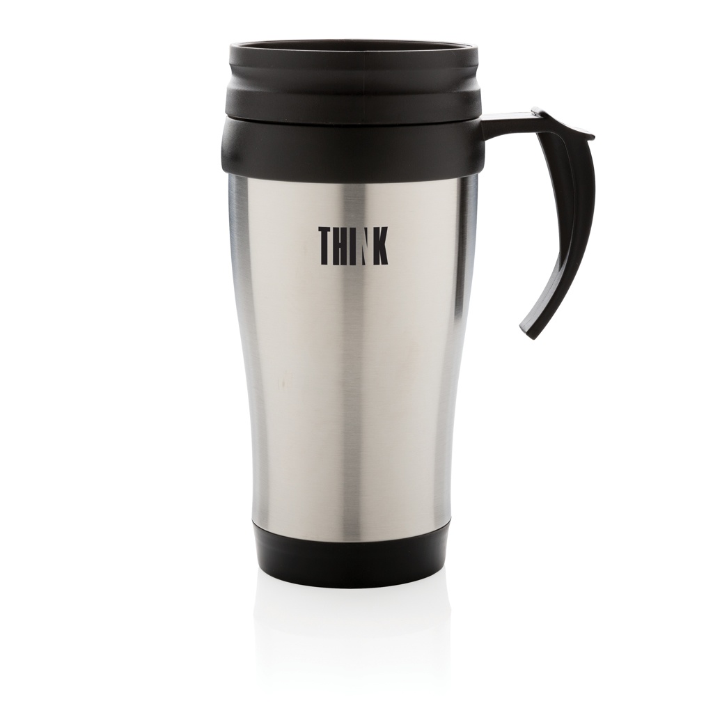 350ml stainless steel outside and PP inside mug with lid and base in black.