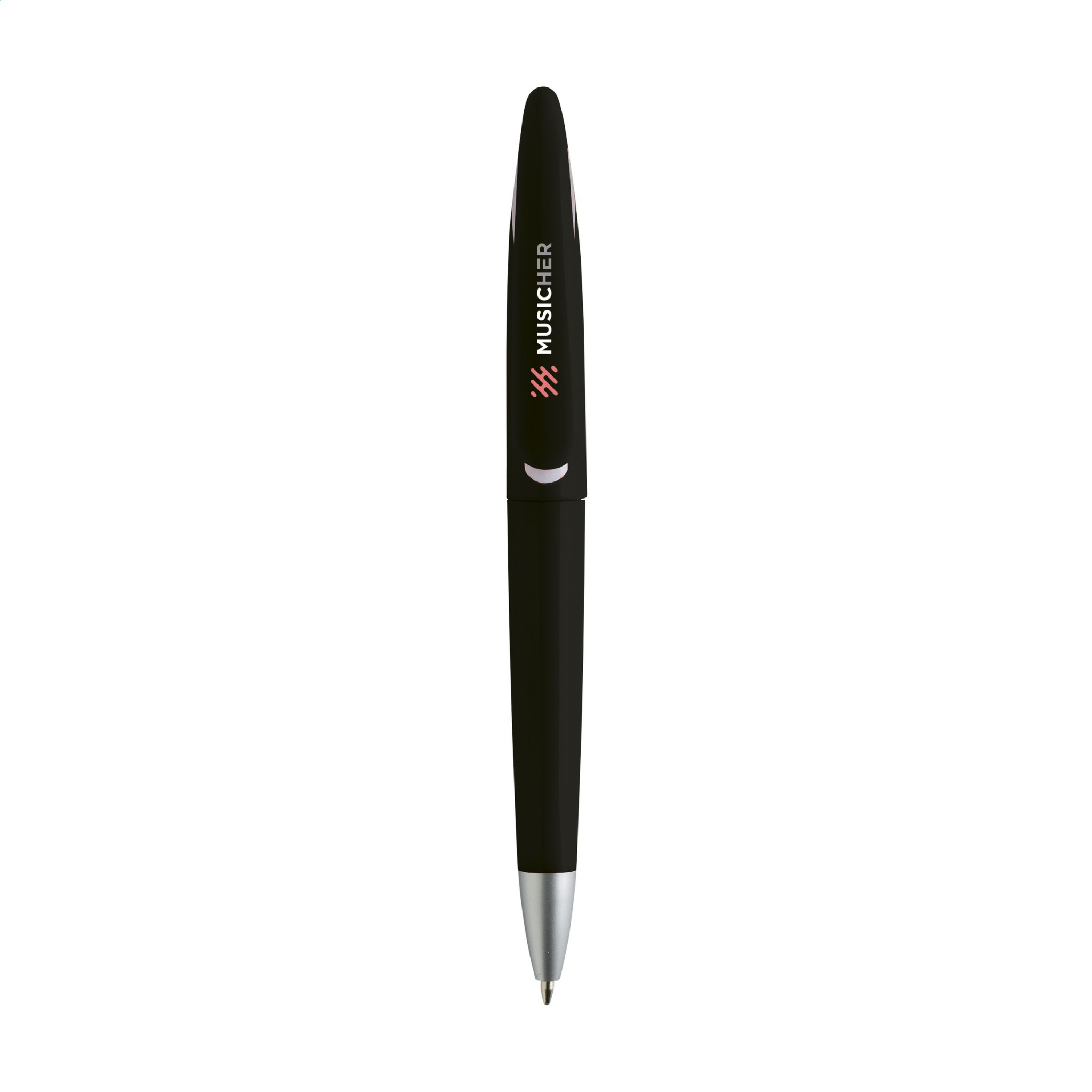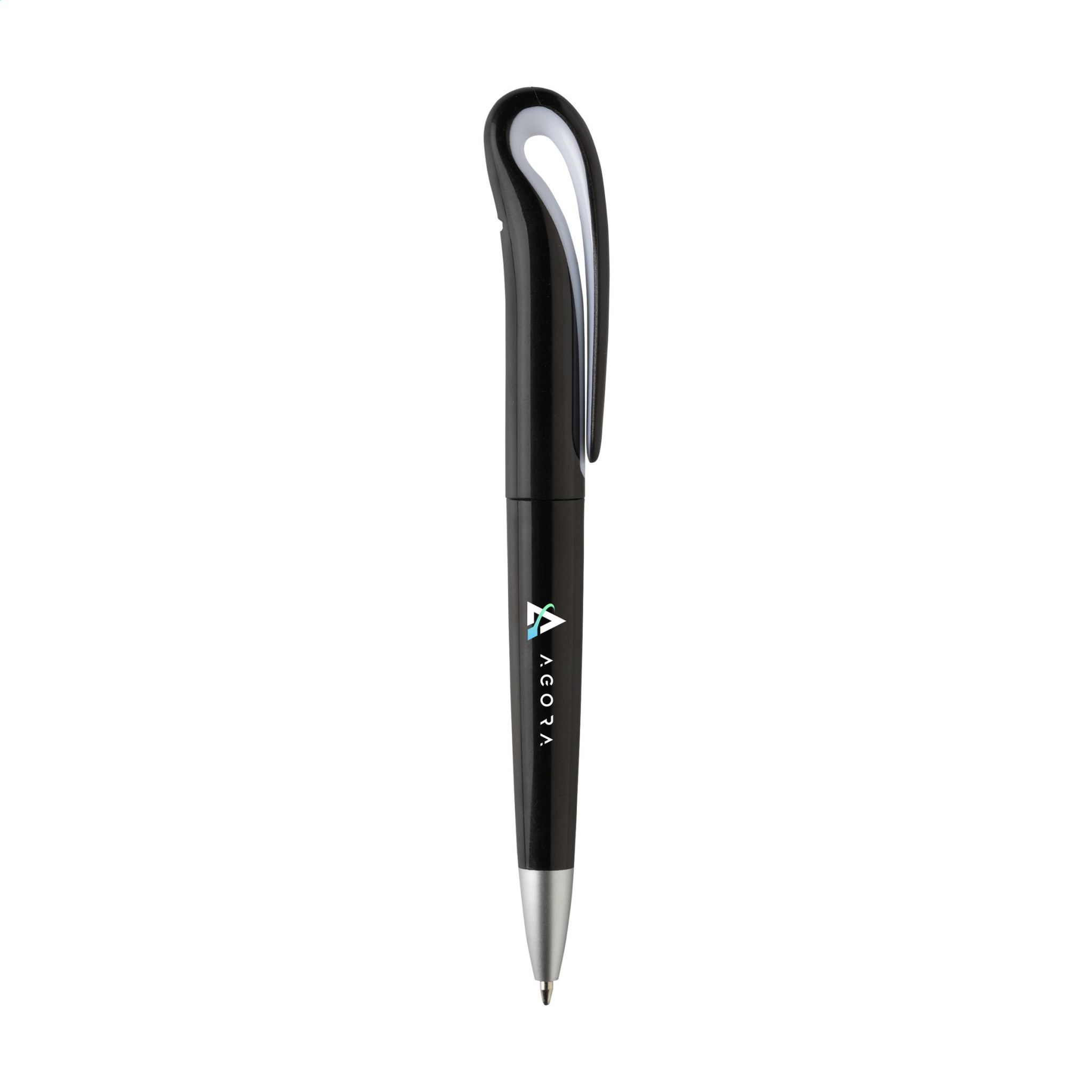 Blue ink ballpoint pen with a fine curved clip with a white accent and twist mechanism.
