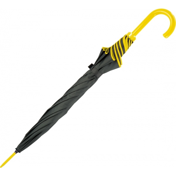 Automatic umbrella made of 190T pongee with fiberglass poles, plastic handle, colored rim, handle and frame. We print your logo on one segment.