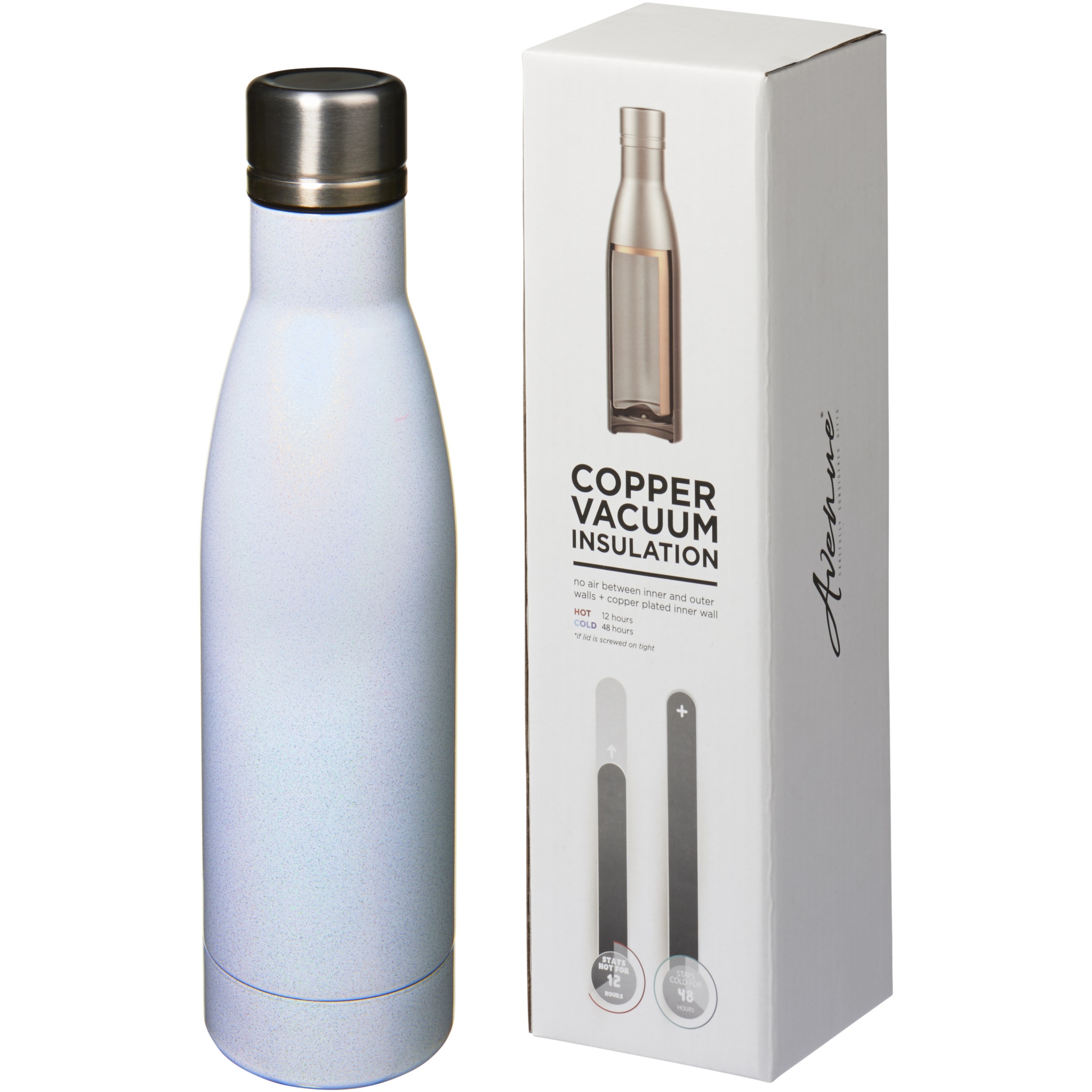 Keep your drinks hot for 12 hours or cold for 48 hours with the Vasa Aurora copper vacuum insulated bottle. Double walled and made from stainless steel with vacuum insulation and a copper plated inner wall, which means that your beverage is kept piping hot or ice cold depending on your requirements. The bottle has a psychedelic and iridescent finish. BPA Free and tested and approved under German Food Safe Legislation (LFGB), and for Phthalates Content under REACH. Volume capacity: 500 ml. Delivered in a gift box.