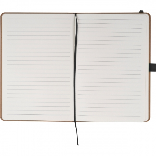 A5 formaadis märkmik taaskasutatud paberist, millel on 160 lehte, järjehoidja ja kummipaelaga sama värvi pliiatsiaas.